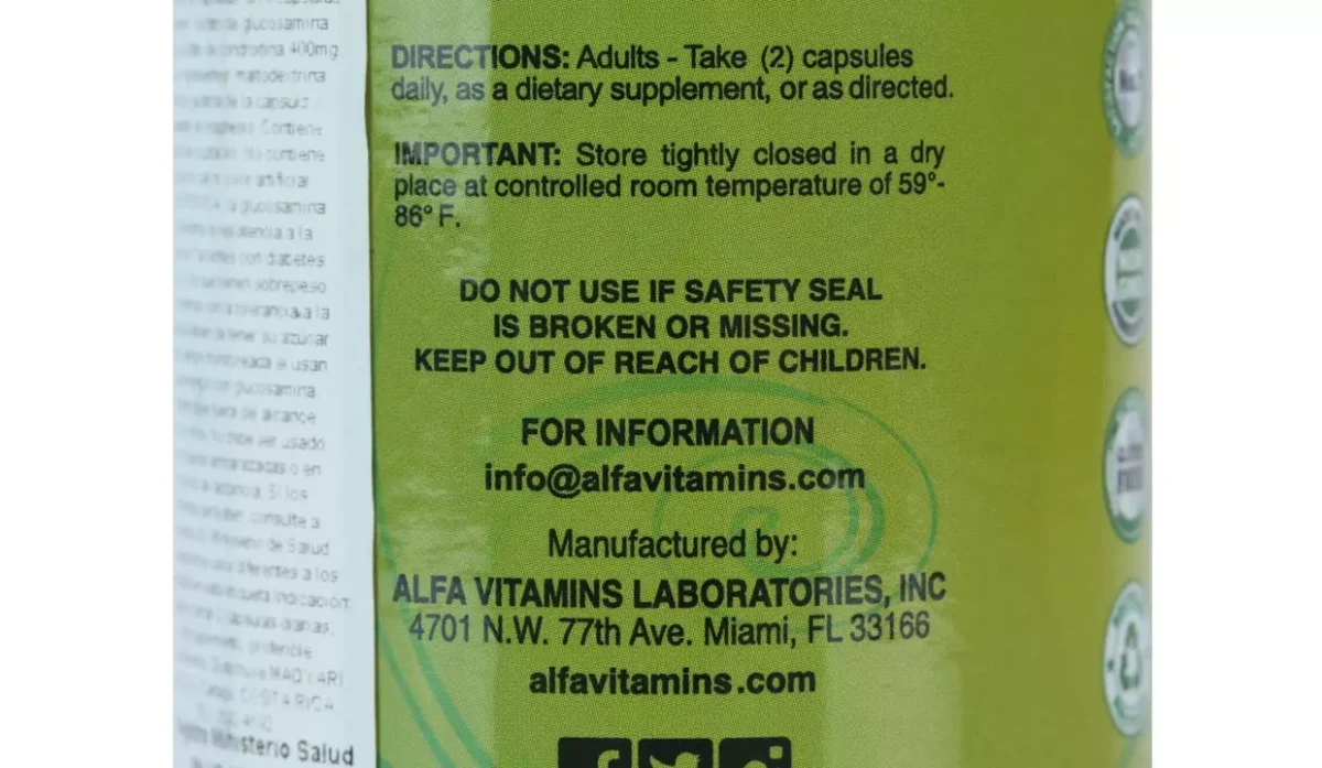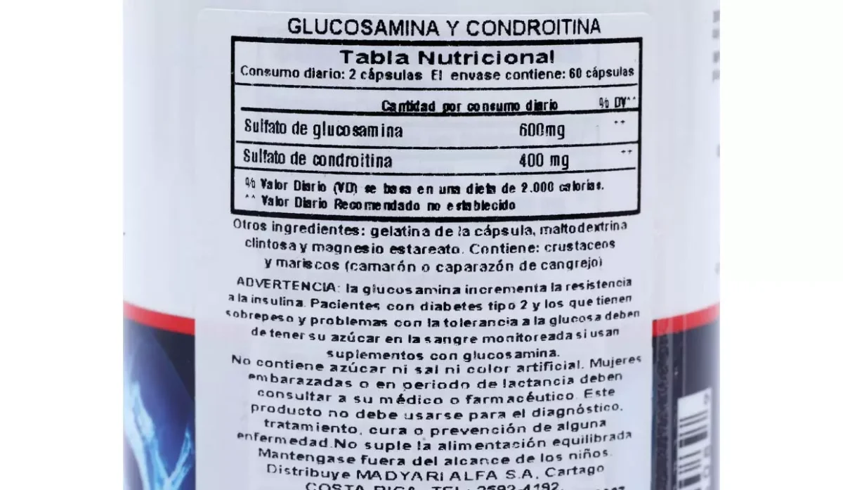 - Sulfato de glocosamina, sulfrato de condroitina, maltodextrina clintosa, gelatina de la cápsula y estearato de magnesio y tazas de crustaceo.