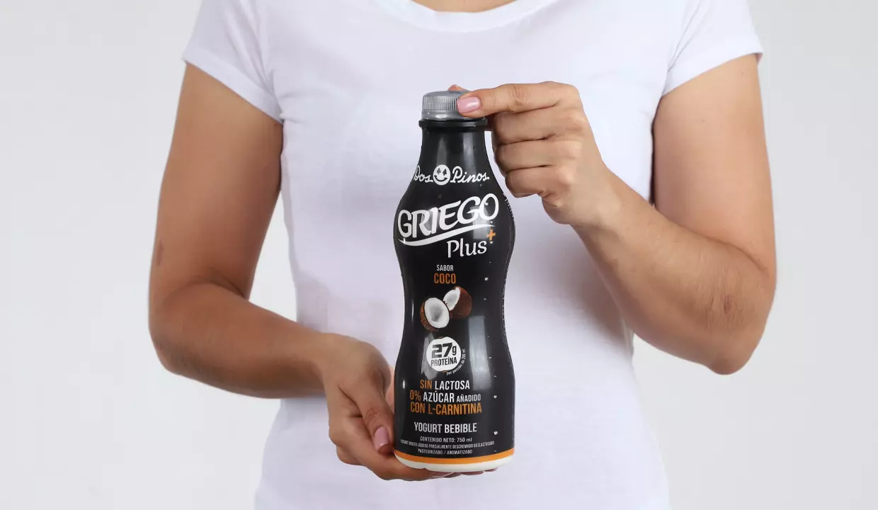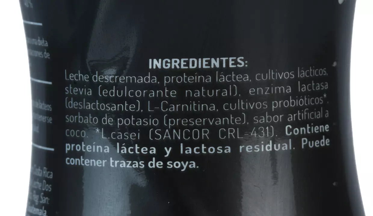 - Leche descremada, proteína láctea, cultivos lácticos, stevia, carnitina y sabor artificial a coco.