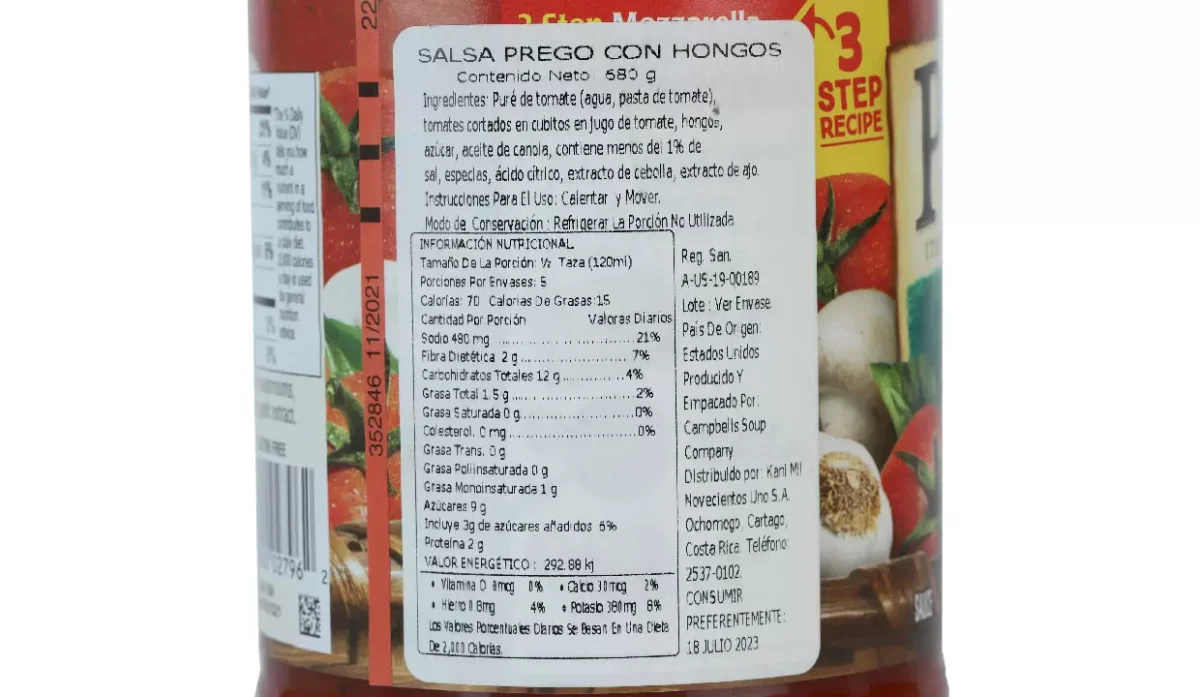 - Puré de tomate, en trozos y en jugo, hongos, azúcar, aceite de canola, sal, especias, ácido cítrico, extracto de cebolla y ajo.