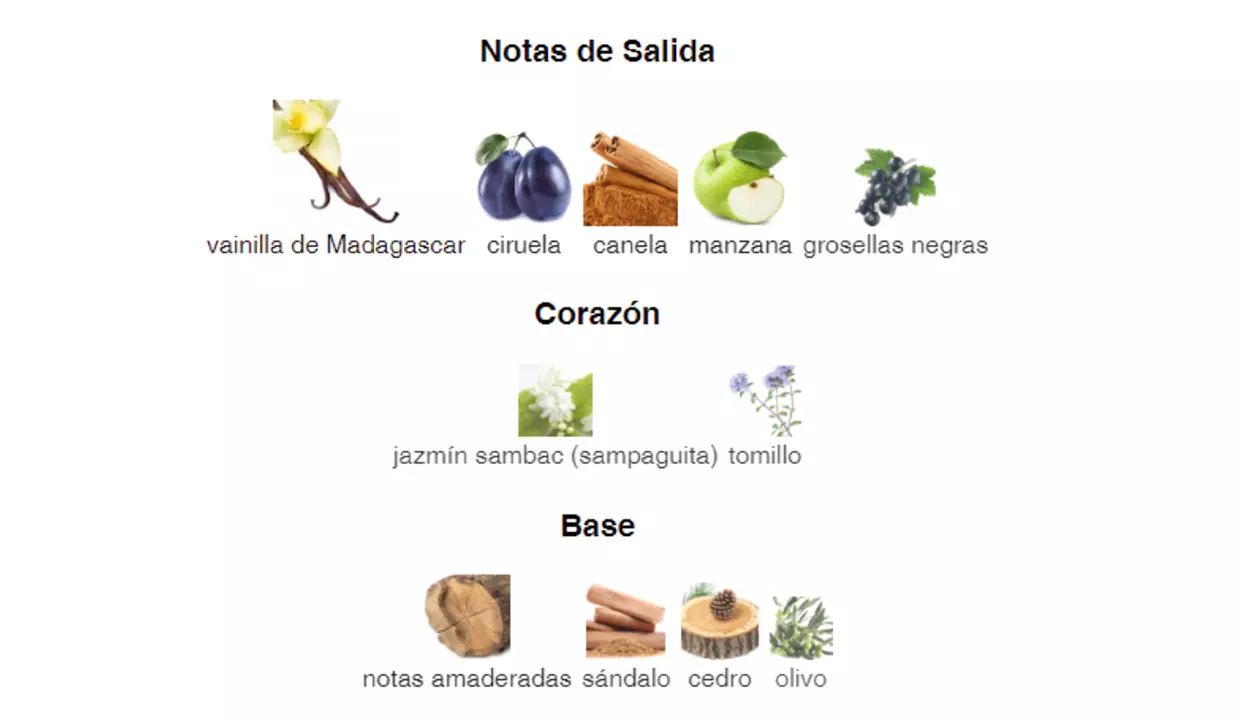 - Notas de salida: vainilla de Madagascar, ciruela, canela, manzana y grosellas negras.