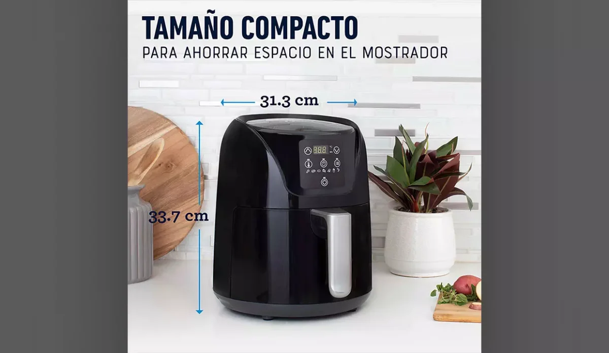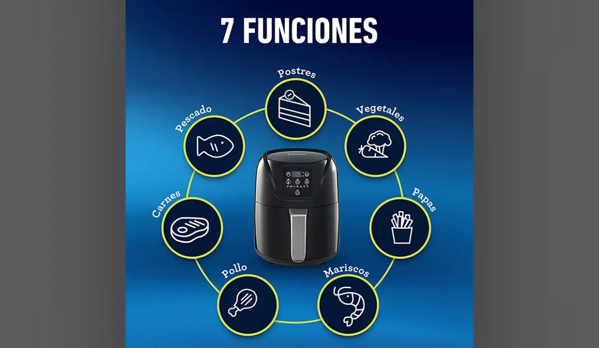 - Cuenta con 7 funciones digitales preestablecidas para cocinar pollo, pescados, mariscos, carnes, papas fritas, vegetales y postres.