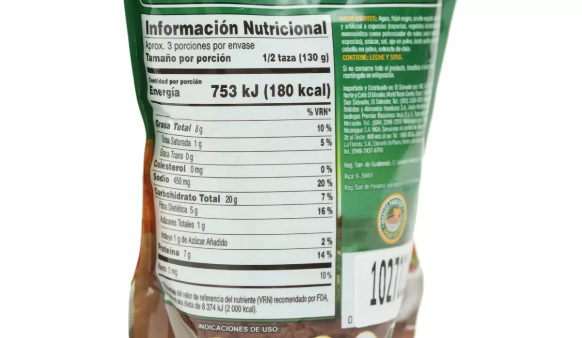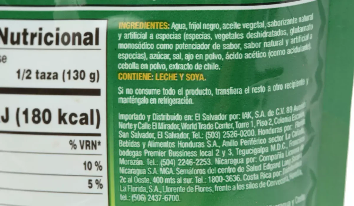 - Agua, frijol negro, aceite vegetal, saborizante natural y artificial a especias, azúcar, sal y ajo en polvo.