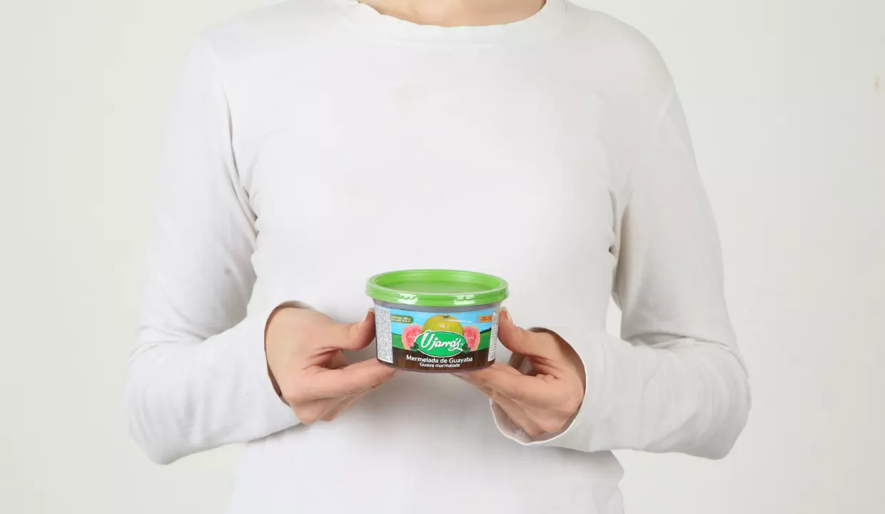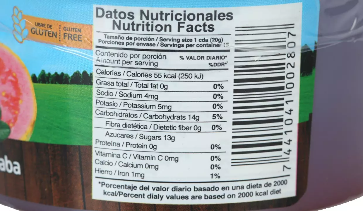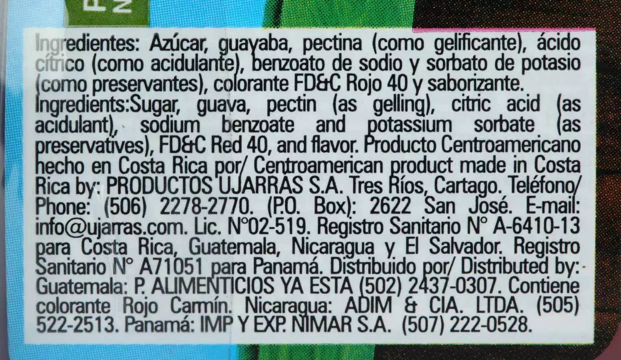 - Azúcar, pulpa de guayaba, ácido cítrico, pectina, colorante rojo #40 y benzoato de sodio.