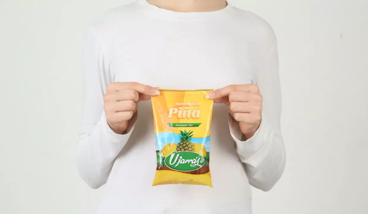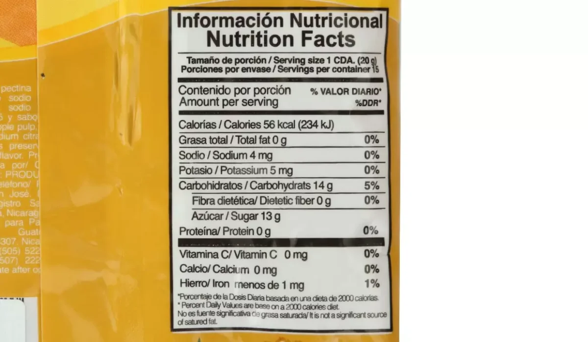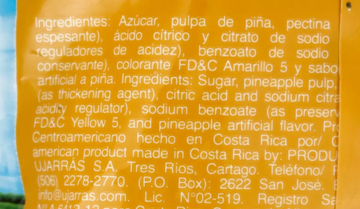 - Azúcar, piña, pectina, ácido cítrico, citrato de sodio, benzoato de sodio, colorante amarillo #5 y saborizante.
