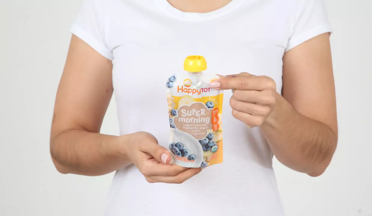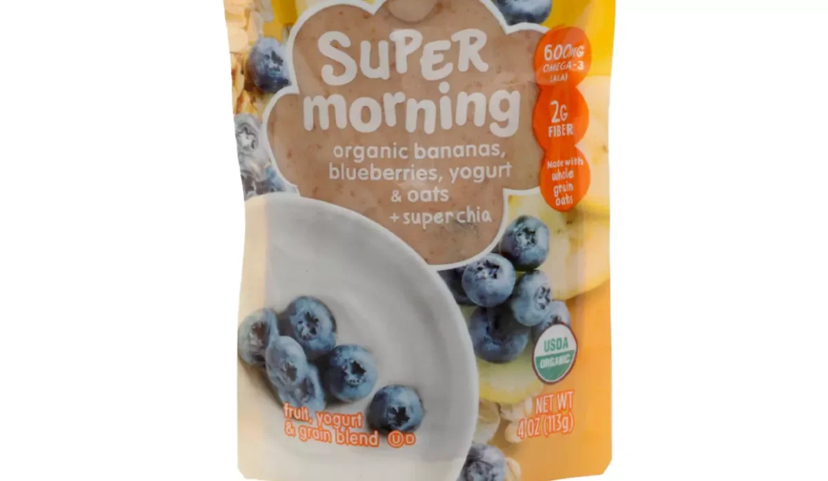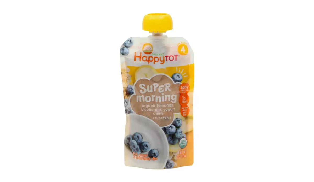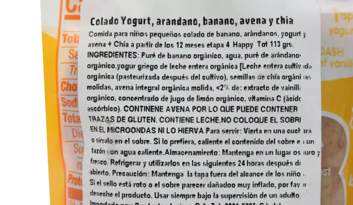- Puré de banano orgánico, agua, puré de arándanos orgánicos, yogurt griego de leche entera orgánica [leche entera cultivada orgánica (pasteurizada después del cultivo)], semillas de chía orgánicas molidas, avena integral orgánica molida, <2 % de: extracto de vainilla orgánico, jugo de limón orgánico Concentrado, Vitamina C (Ácido Ascórbico).