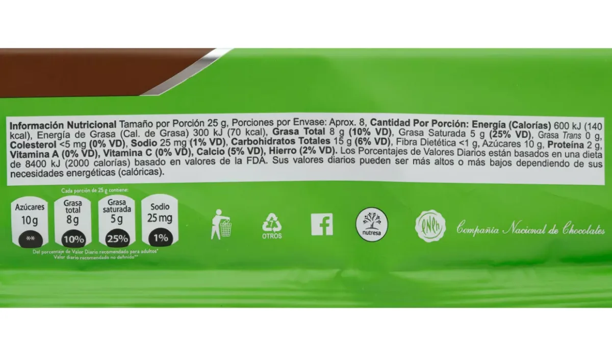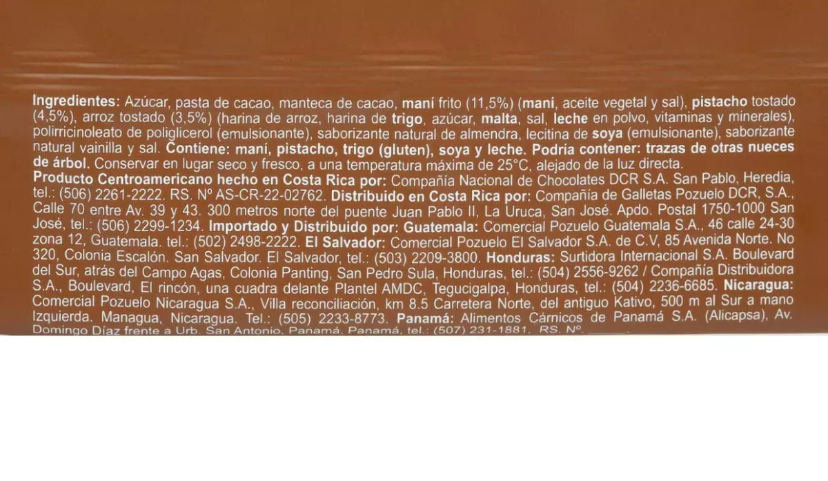 - Azúcar, pasta de cacao, manteca de cacao, maní frito, aceite vegetal, sal, pistacho tostado y arroz tostado.