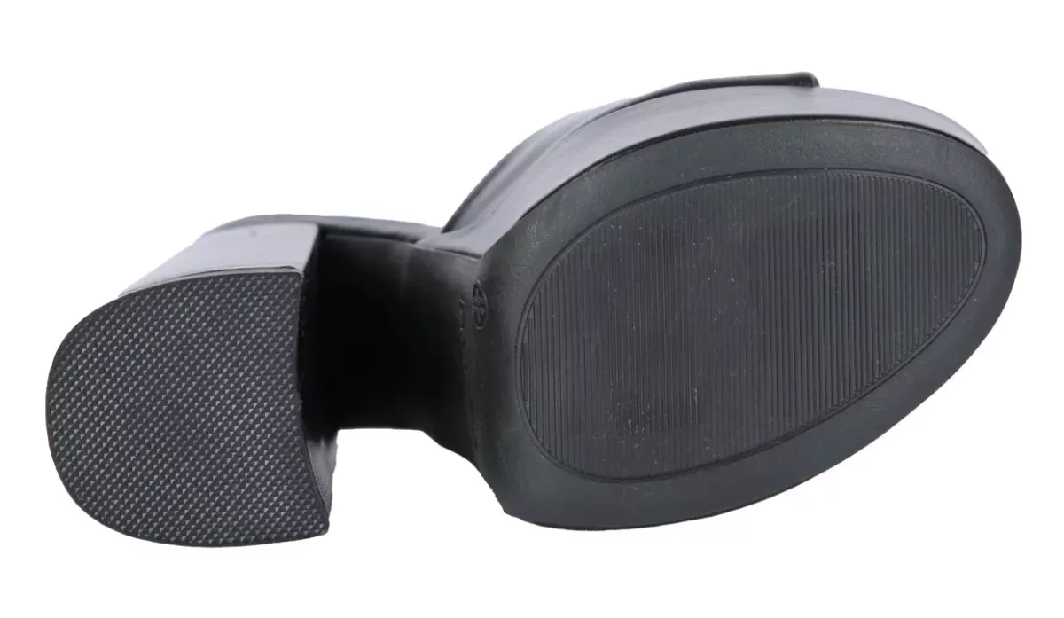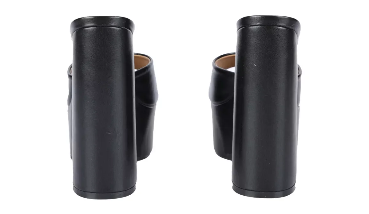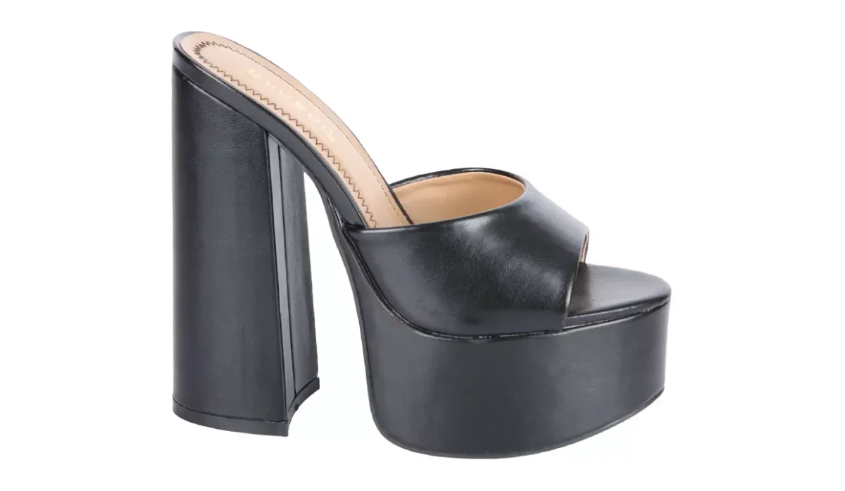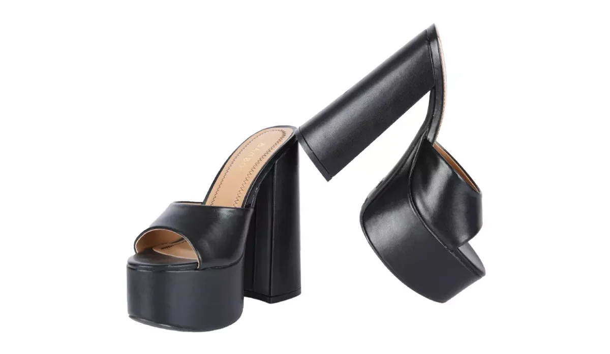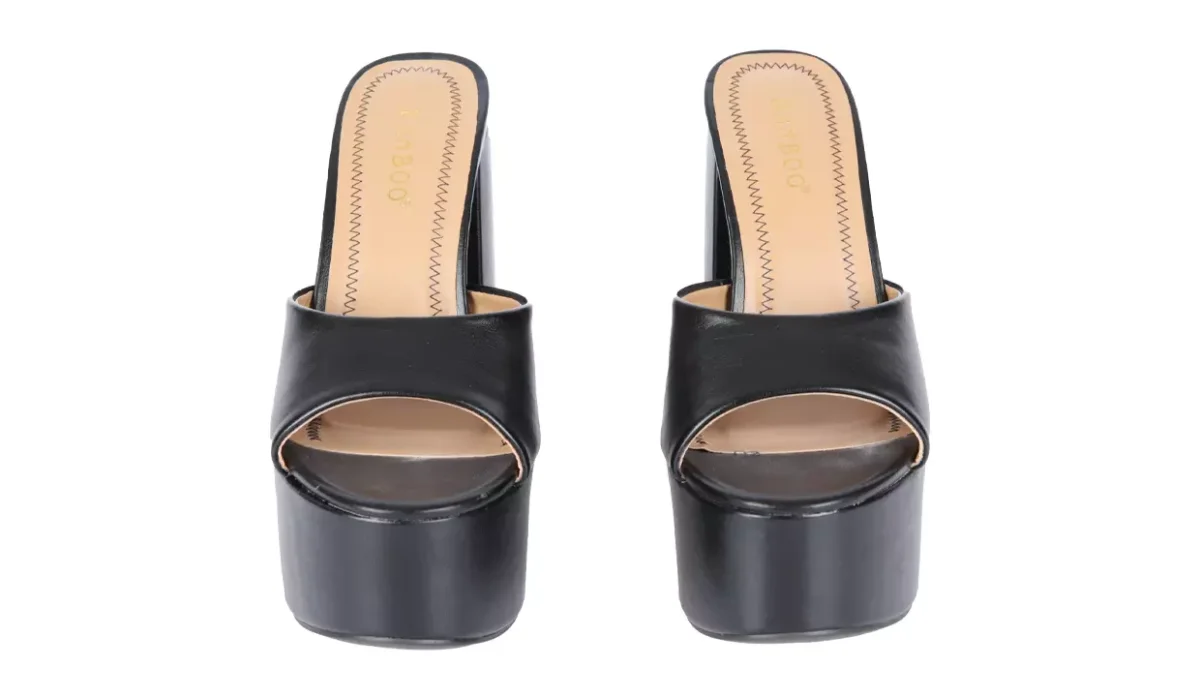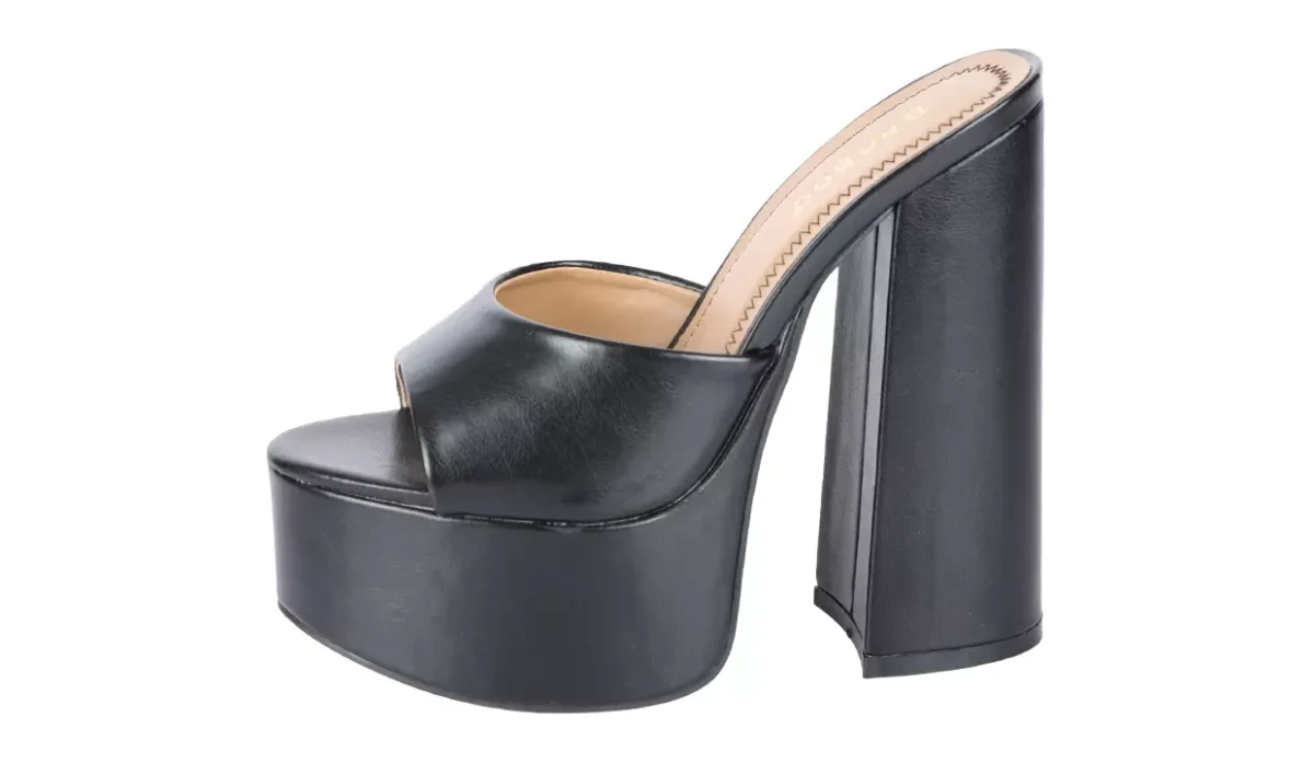 - Con tacón acampanado grueso y suela de plataforma.
