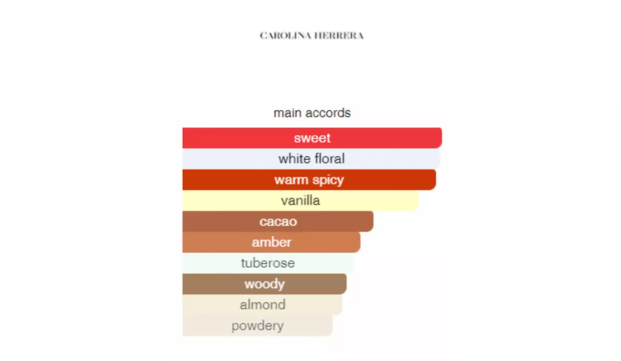 - Notas de fondo: haba tonka, cacao, vainilla, praliné, sándalo, almizcle, ámbar, madera de cachemira, canela, pachulí y cedro.