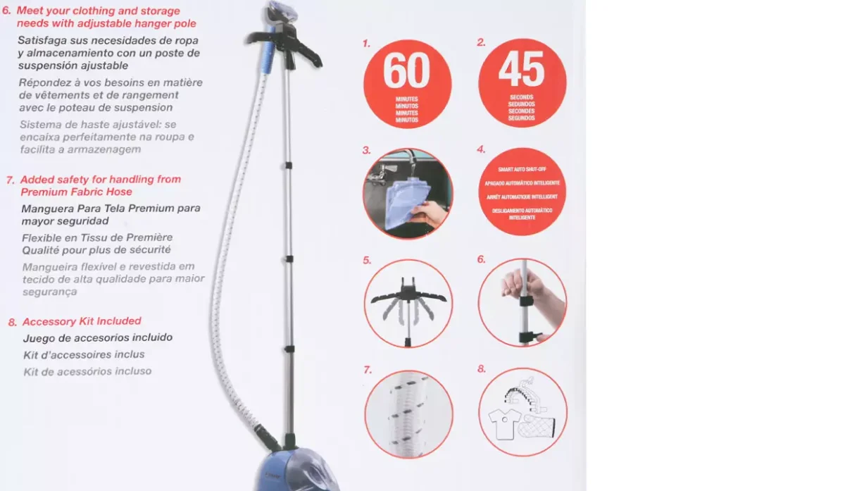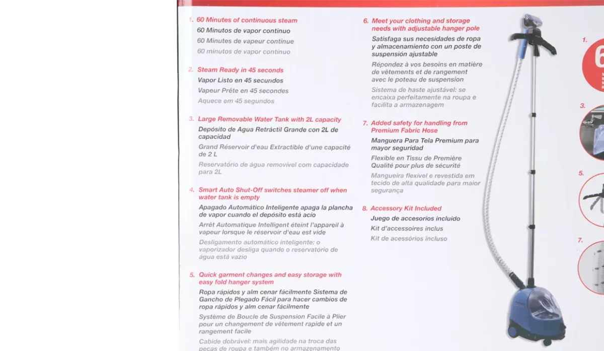 - Hasta 60 minutos de salida de vapor constante para eliminar las arrugas difíciles.