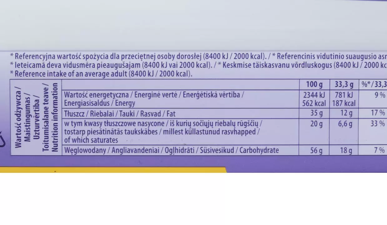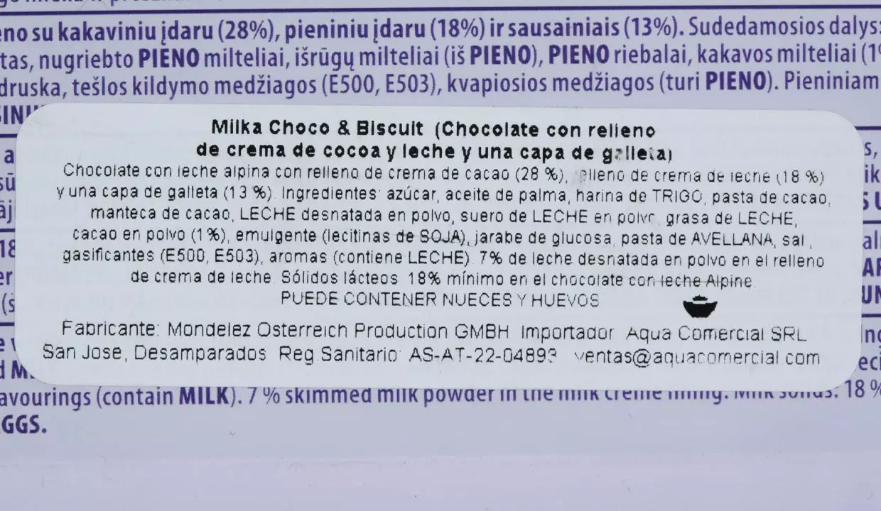 - Azúcar, aceite de palma, harina de trigo, pasta de cacao, cacao en polvo, pasta de avellana, leche desnatada en polvo y grasa de leche.