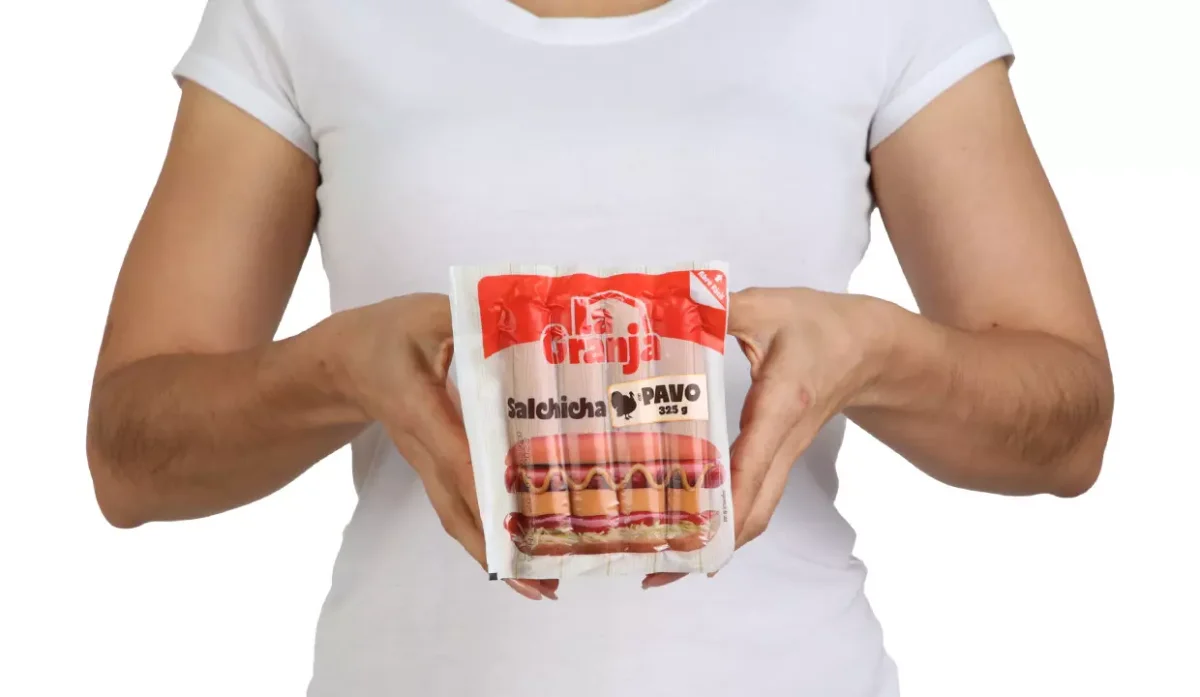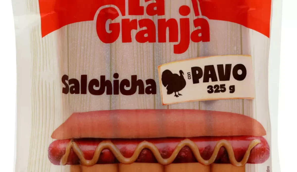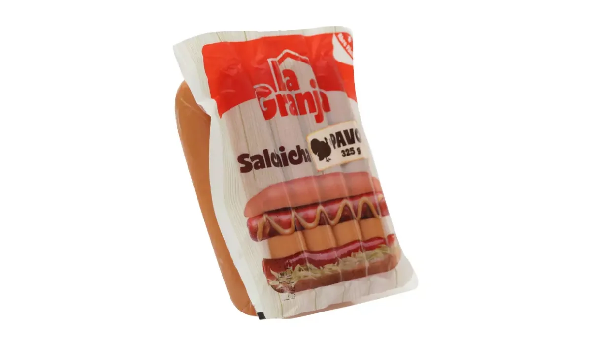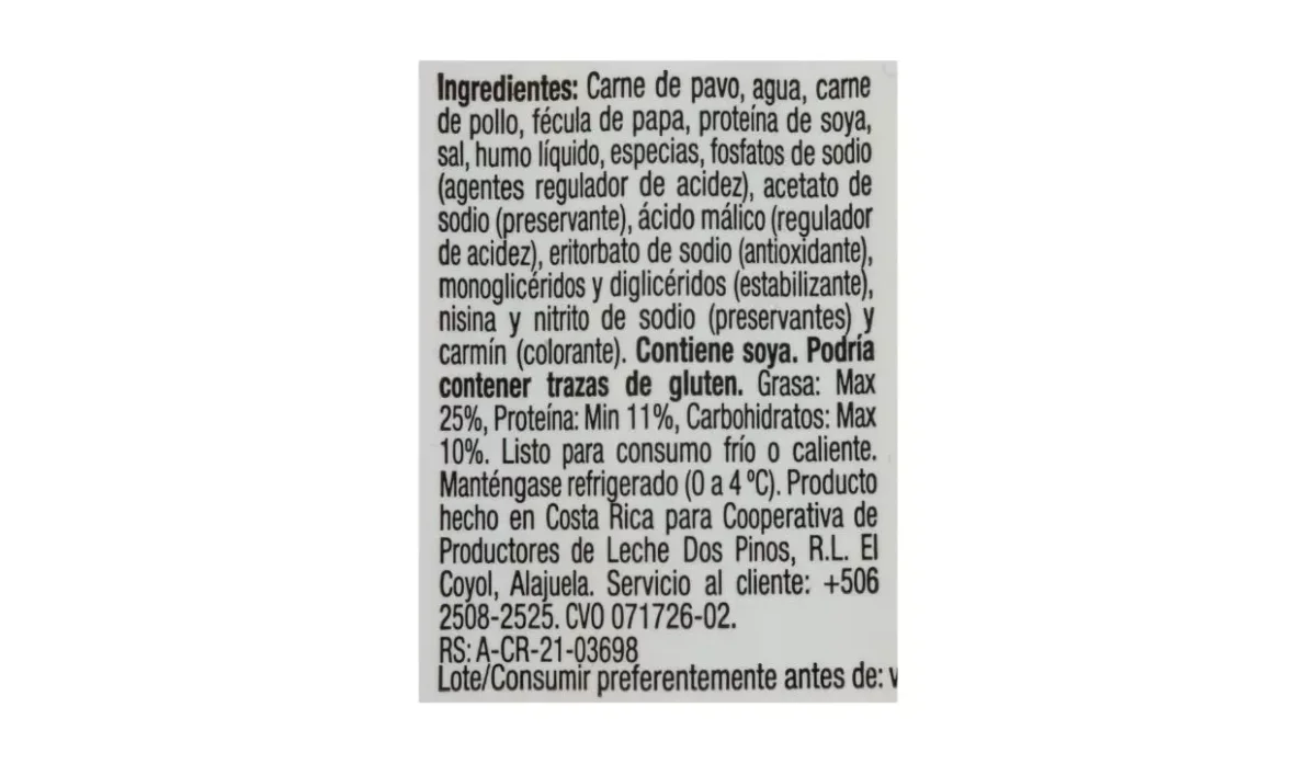 - Carne de pavo, agua, carne de pollo, fécula de papa, proteína de soya, sal, humo líquido, especias, fosfatos de sodio (agentes regulador de acidez), acetato de sodio (preservante), ácido málico (regulador de acidez), eritorbato de sodio (antioxidante), monoglicéridos y diglicéridos (estabilizante), nisina y nitrito de sodio (preservantes) y carmín (colorante).