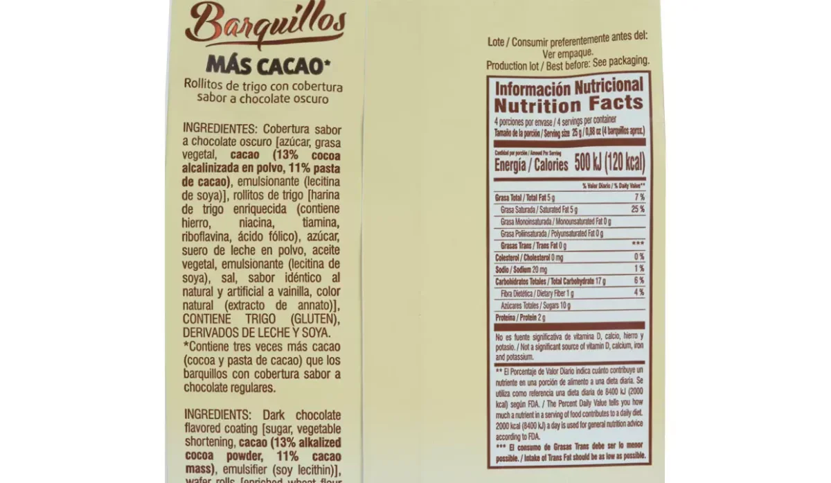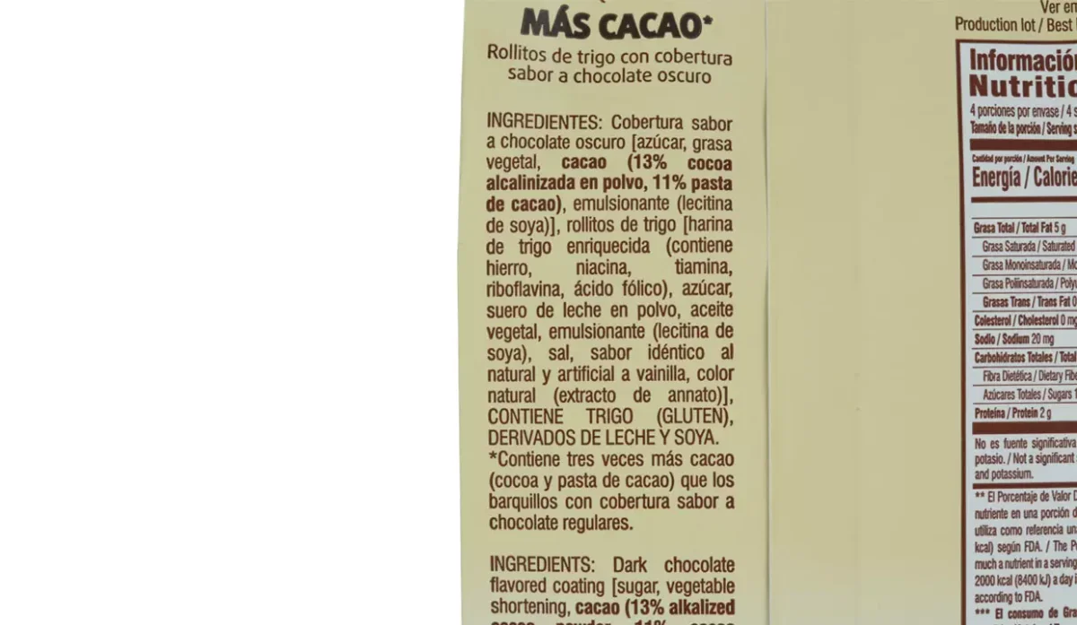 - Cobertura sabor a chocolate oscuro, azúcar, grasa vegetal, cacao (13% cocoa alcalinizada en polvo, 11% pasta de cacao), emulsionante, leticina de soya, rollitos de trigo, harina de trigo enriquecida, hierro, niacina, tiamina, riboflavina, ácido fólico suero de leche en polvo y aceite vegetal.