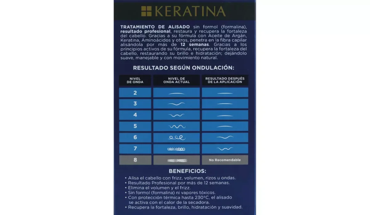 - Su fórmula con aceite de argán, keratina, aminoácidos, penetra en la fibra capilar alisándola por más de 12 semanas.