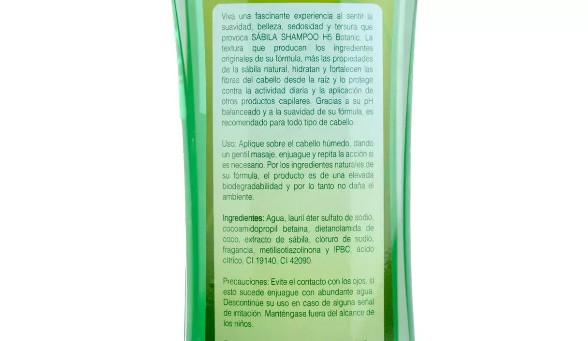 - Agua, lauril eter sulfato de sodio, cocoamidopropil betaina, dietanolamida de coco, extracto de sábila, cloruro de sodio, fragancia, metilisotiazolinona y ácido cítrico.