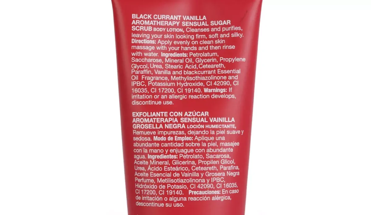 - Petrolato, sacarosa, aceite mineral, glicerina, propilen glicol, urea, ácido esteárico, ceteareth, parafina, aceite esencial de vainilla y grosera negra perfume.