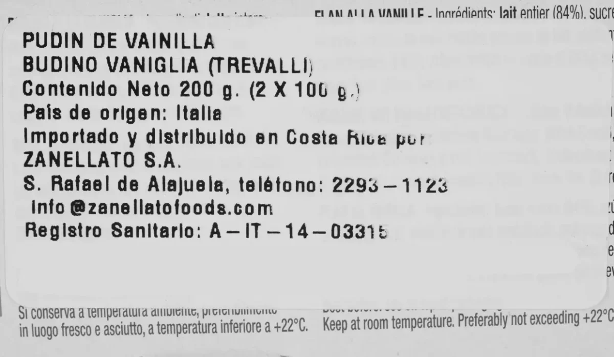 - Leche entera (84%), azúcar, almidón de maíz, almidón de maíz modificado, proteínas de leche, gelificante : carragenina (E407), aroma, extracto de vainilla (0,04%), sal, colorante: annatto (E160b).