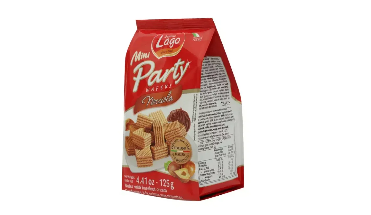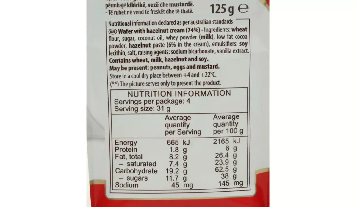 - Harina de trigo, azúcar, aceite de coco, suero de leche en polvo, cacao magro en polvo, pasta de avellanas, emulgentes, lecitina de soja, sal, gasificantes. carbonato ácido de sodio, extracto de vainilla.