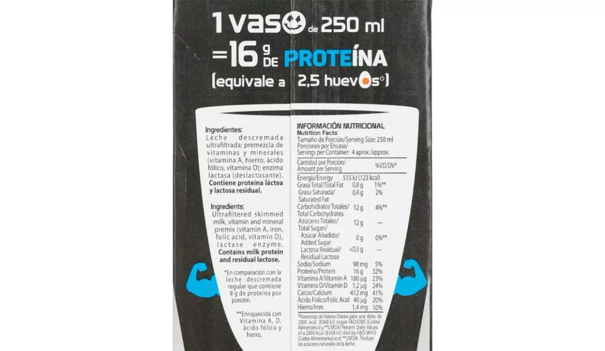 - Leche descremada ultrafiltrada, premezcla de vitaminas y minerales (Vitamina A, hierro, ácido fólico, Vitamina D), enzima deslatosante.