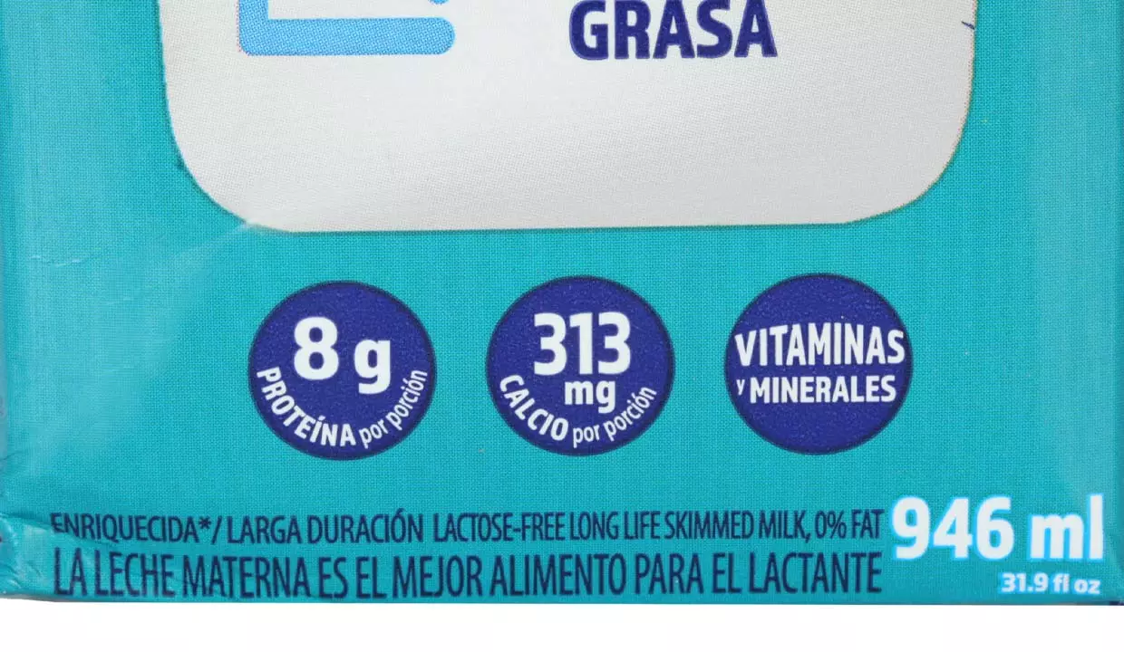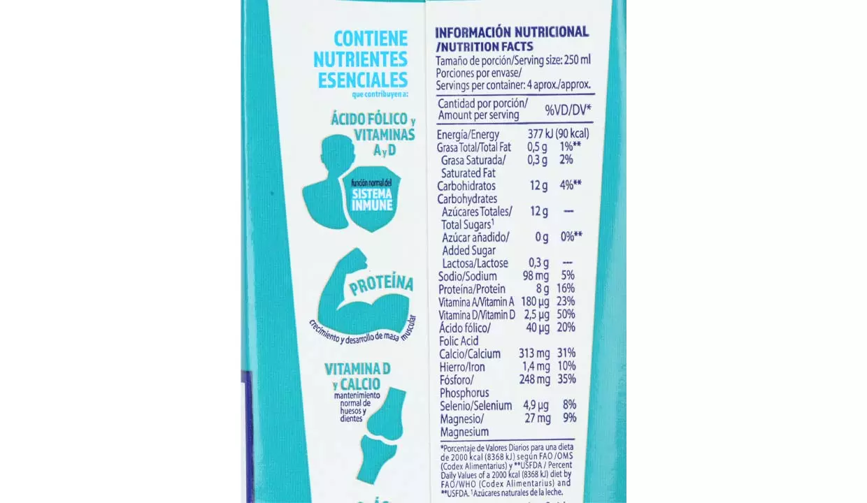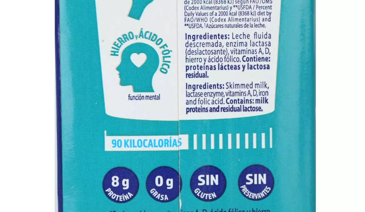 - Leche fluida descremada, enzima lactasa, vitaminas A,D, hierro y ácido fólico.
