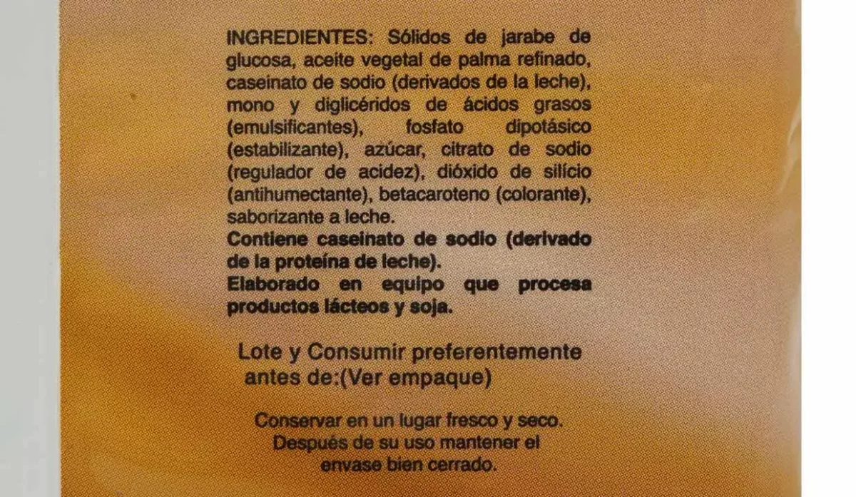- Caseinato de sodio (derivado de la proteína de la leche) y azúcar.