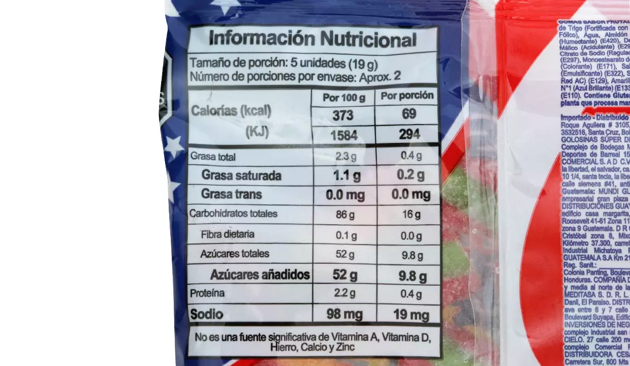 - Azúcar, jarabe de glucosa, harina de trigo, niacina, hierro, vitamina B1, B2, ácido fólico, agua, almidón modificado de papa, grasa vegetal, sorbitol, dextrosa, ácido cítrico, ácido málico, gelatina, saborizante artificial a tutti frutti, citrato de sodio, ácido fumárico, lecitina de soya y sal.