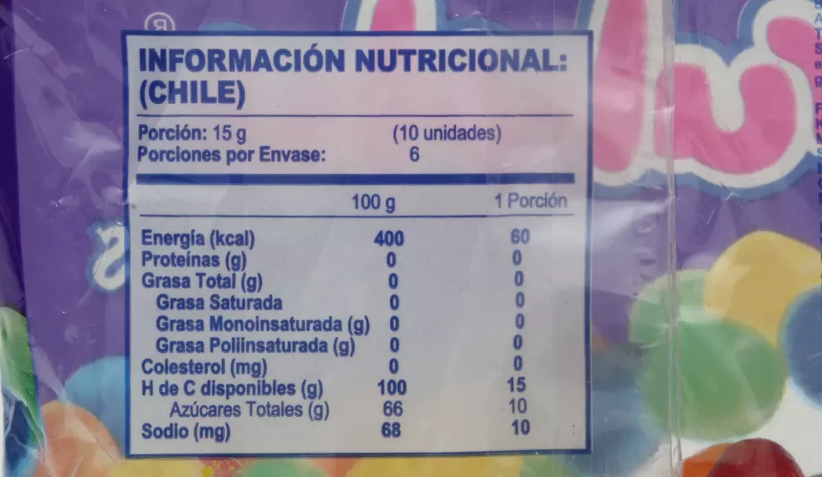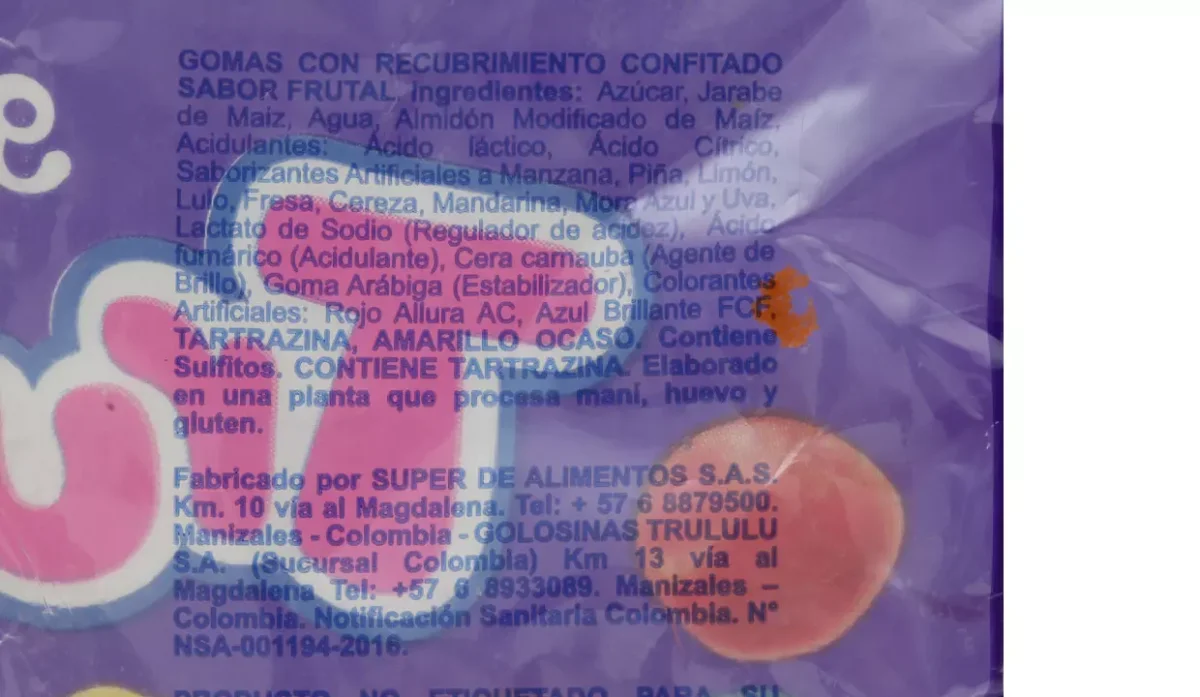 - Azúcar, jarabe de maíz, agua, almidón modificado de maíz, ácido láctico, ácido cítrico, saborizantes artificiales: manzana, piña, limón, lulo, fresa, cereza, mandarina, mora azul y uva, lactato de sodio, ácido fumárico, cera carnauba, goma arábiga, colorantes artificiales.