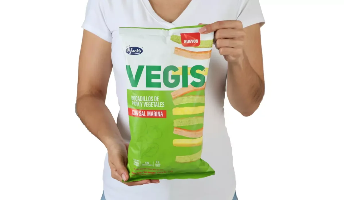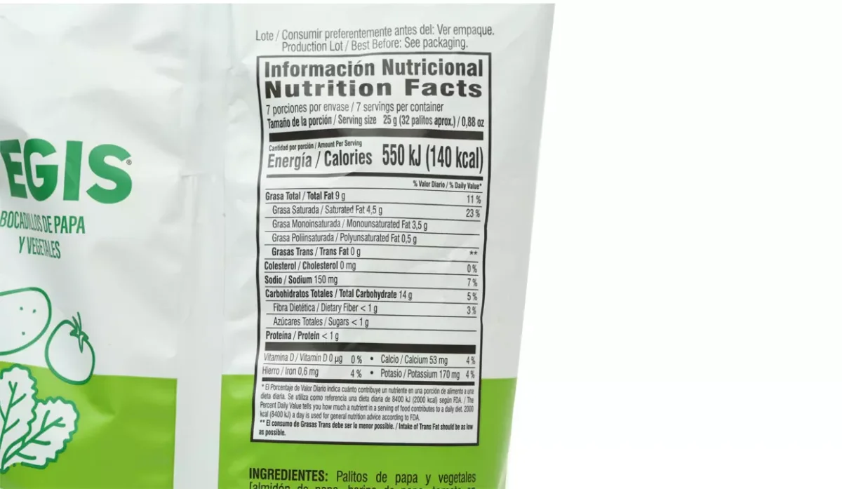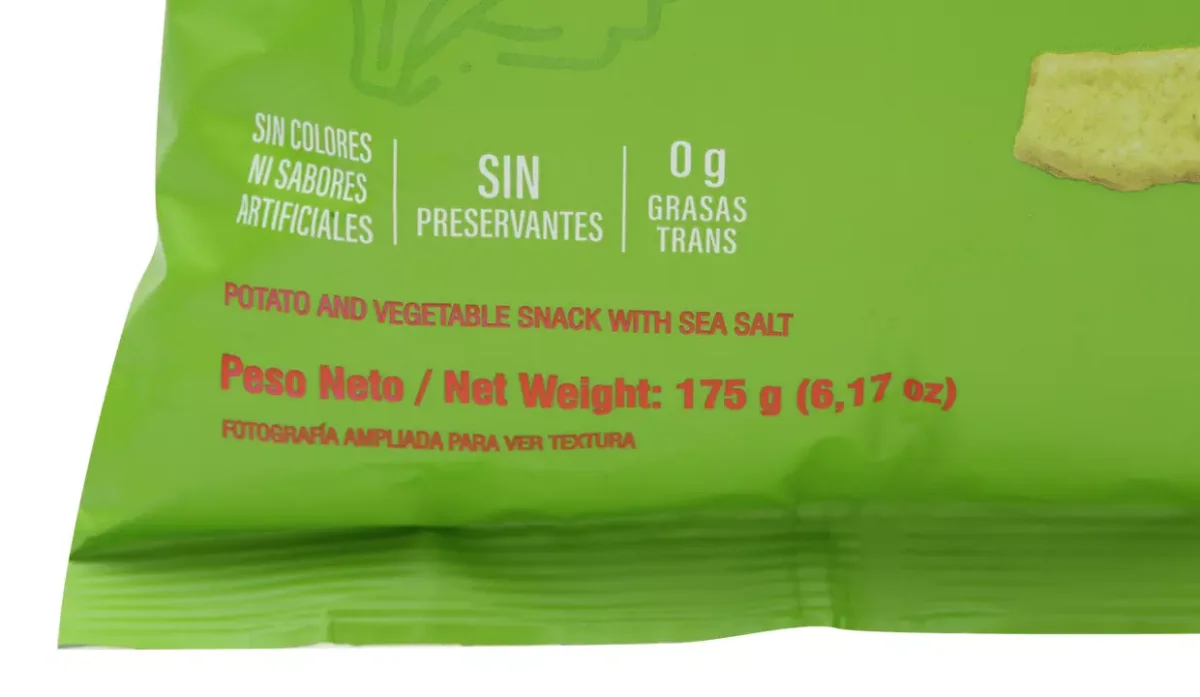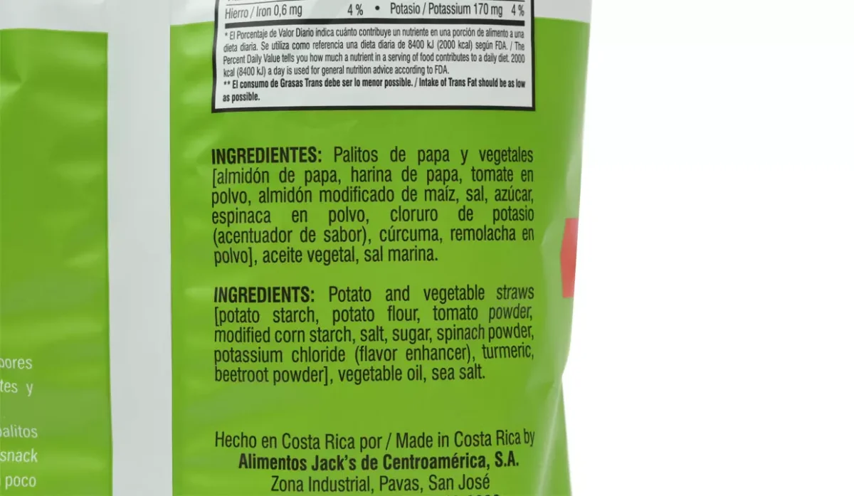 - Palitos de papa y vegetales, almidón de papa, harina de papa, tomate en polvo, almidón modificado de maíz, sal, azúcar, espinaca en polvo, cloruro de potasio, cúrcuma, remolacha en polvo, aceite vegetal y sal marina.