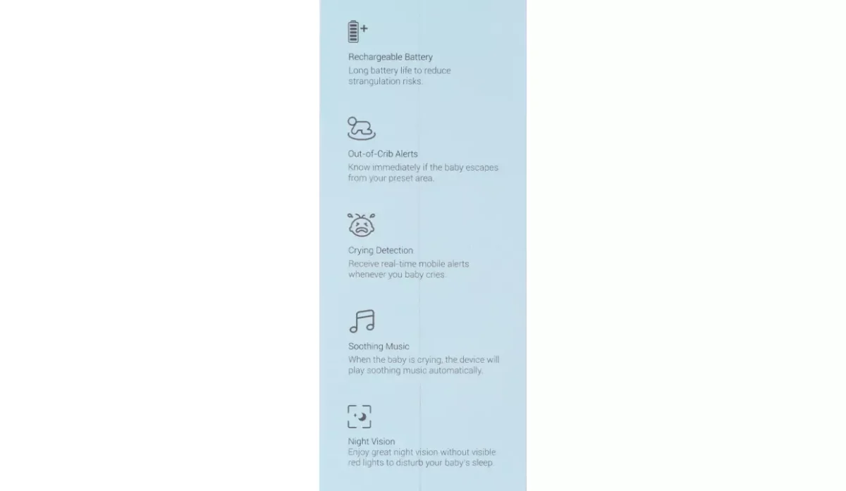 - Transforma su avanzada cámara y su tecnología con inteligencia artificial en un asistente visualmente agradable, fácil de usar y seguro para su bebé que simplifica las tareas diarias.