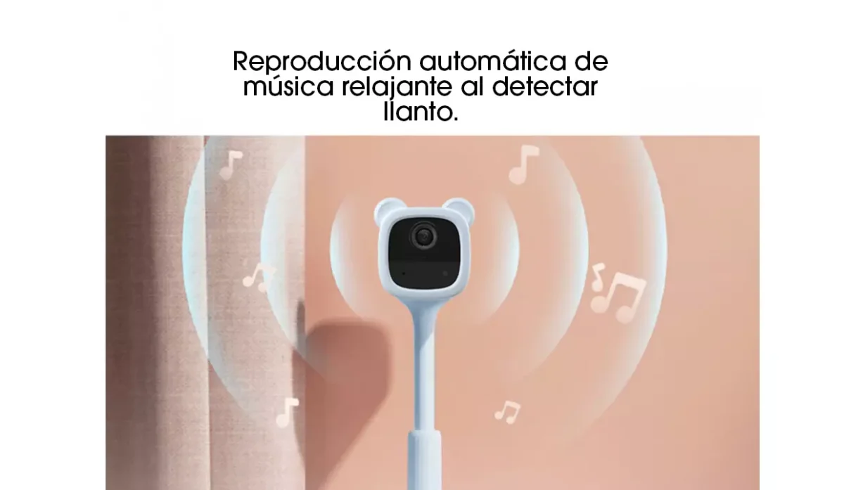 - Al detectar el sonido del llanto, el monitor puede reproducir automáticamente música relajante para calmarle, además los padres pueden hablar a su bebé a través de la cámara como si estuvieran al lado.