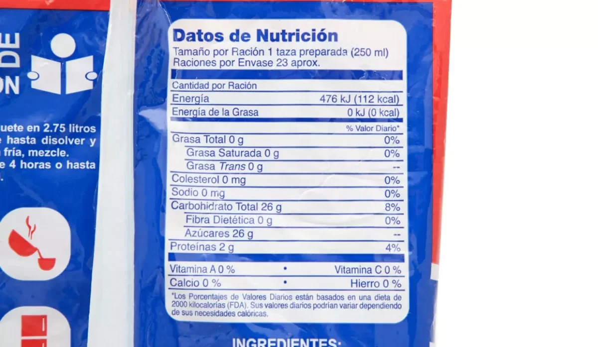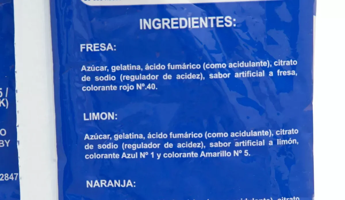 - Azúcar, gelatina, ácido fumárico como acidulante, citrato de sodio regulador de acidez, sabor artificial a fresa y colorante rojo #40.