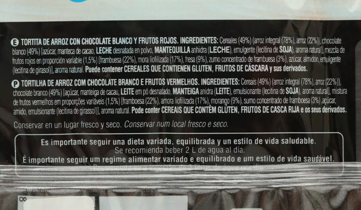 - Cereales, arroz integral, arroz, chocolate blanco, azúcar, manteca de cacao, leche desnatada en polvo, mantequilla anhidra, emulgente, lecitina de soja, aroma natural, mezcla de frutos rojos en proporción variable, frambuesa, mora liofilizada, fresa, zumo concentrado de frambuesa, azúcar, almidón, emulgente.