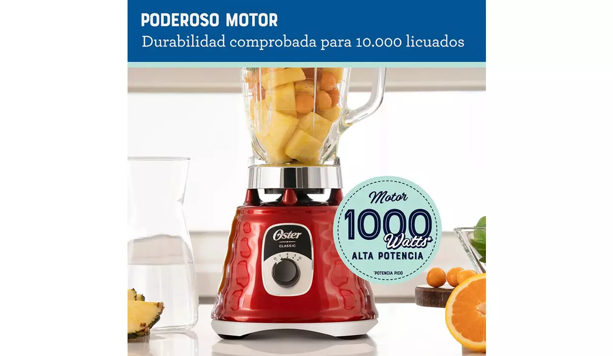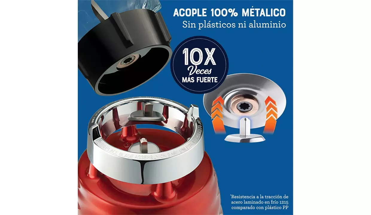 - Sistema de acople de metálico 10 veces más fuerte entre la cuchilla y el eje de la base que prolonga la vida de la licuadora.