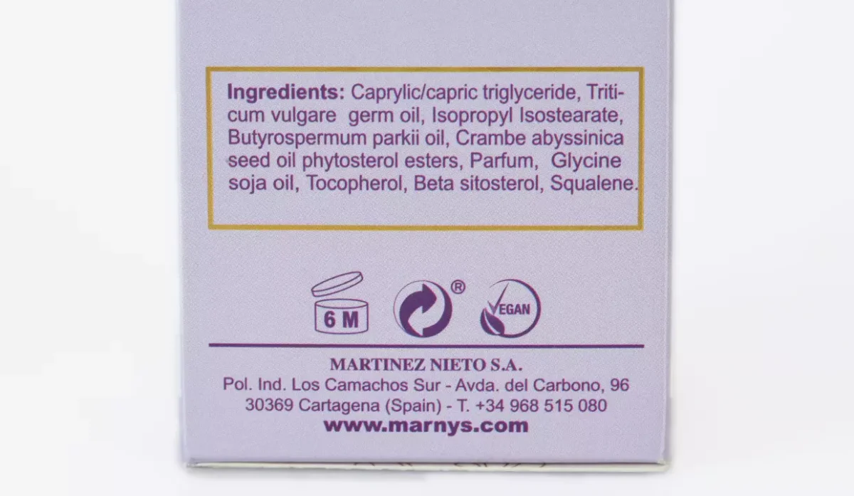 - Triglicérido caprílico cáprico, triticum vulgare, aceite de germen isoestearato de isopropilo, aceite de buttyrospermum parkii, aceite de semilla de crambe abyssinica, ésteres de fitosterol, perfume, glicina, aceite de soja, tocoferol, beta, silosterol y escualeno.