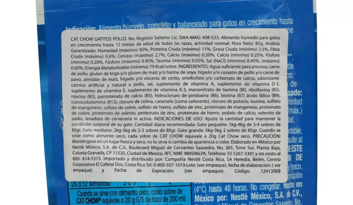 - Agua suficiente para proceso, carne de pollo, gluten de trigo y/o gluten de maíz y/o harina de soya, carne de pescado (sardina y/o tilapia y/o atún), almidón de maíz, ortofosfato y/o carbonato de calcio, hígado y/o corazón de pollo, hígado y/o vísceras de cerdo, saborizante cárnico artificial y natural, sal**, vitaminas (A, D-3, E, K-3, Complejo B, cloruro de colina), cloruro de potasio, taurina, minerales , levadura de cervecería inactiva.