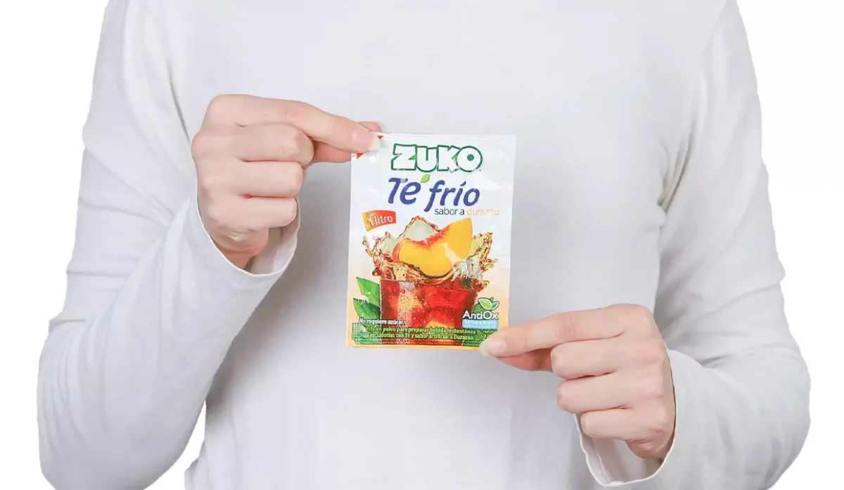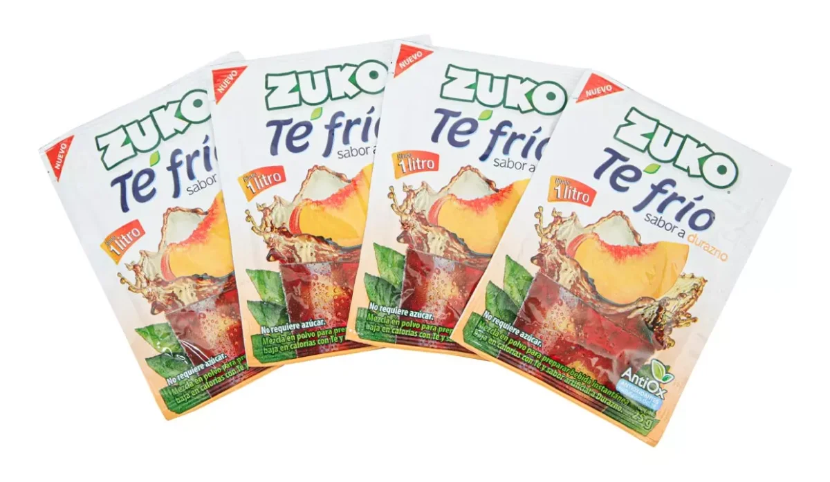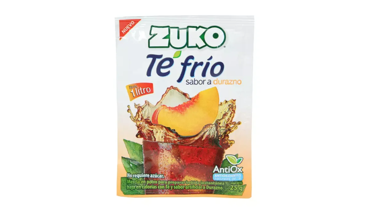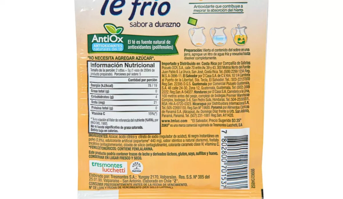 - Azúcar, ácido cítrico, té negro instantaneo en polvo, edulcorante artificial, sabor idéntico al natural (durazno), fosfato tricácico, dióxido de silicio, colorante caramelo clase IV, vitamina C,.