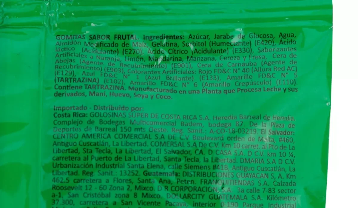 - Azúcar, jarabe de glucosa, agua, almidón modificado de maíz, gelatina, sorbitol (humectante), (E420), ácido láctico (acidulante), (E270), ácido cítrico, (acidulante), (E330), saborizantes artificiales a naranja, limón, mandarina, manzana, cereza y fresa, cera de abejas, cera de carnauba, colorantes artificiales.