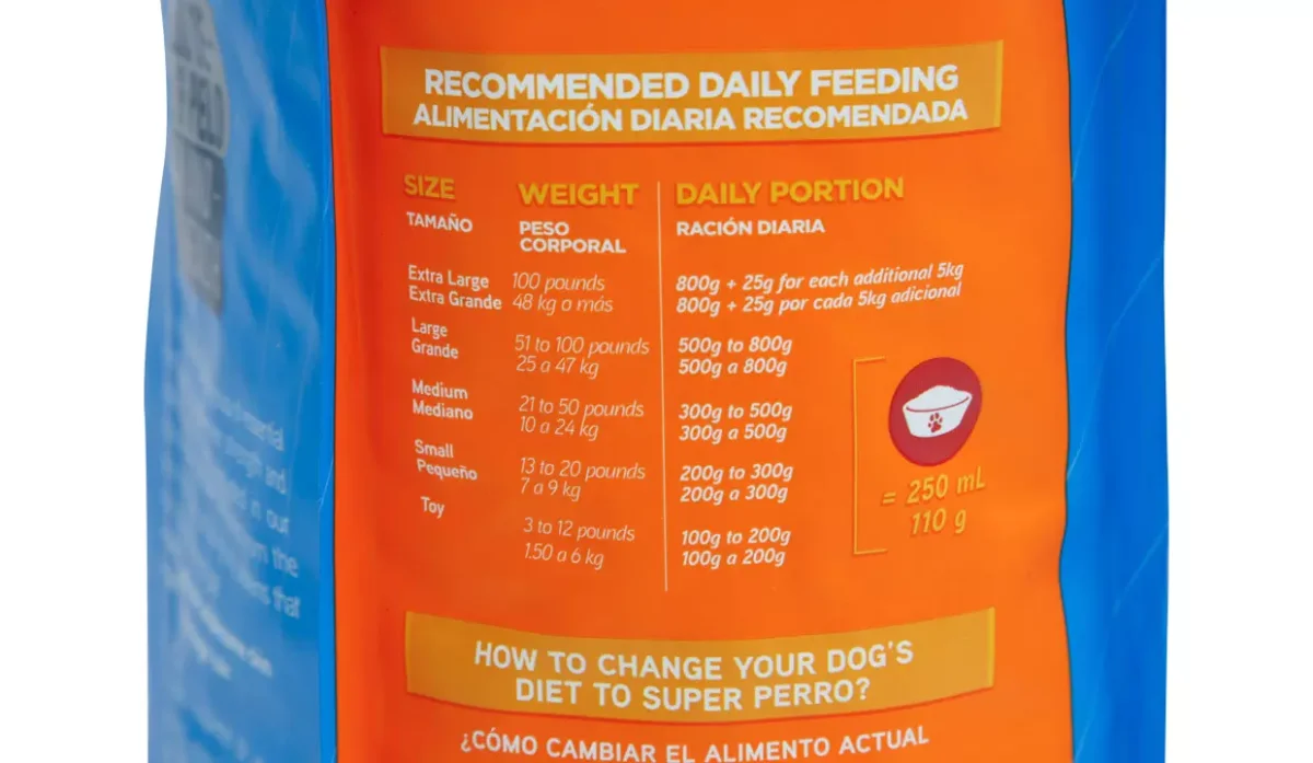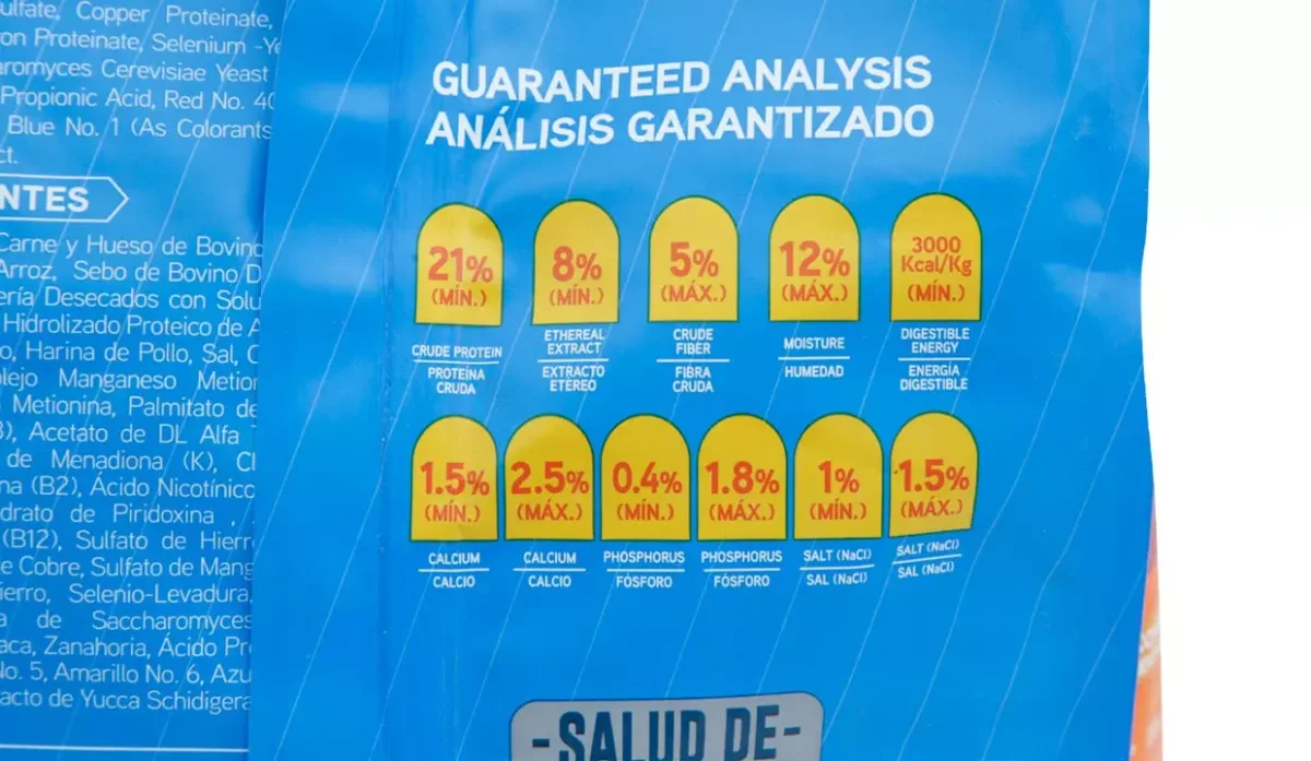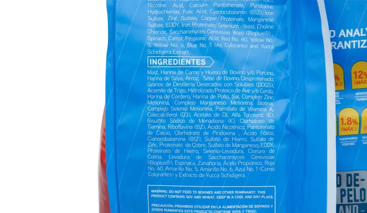 - Maíz, harina de carne y hueso de bovino y/o porcino, harina de soya, arroz, sebo de bovino desproteinado, granos de destilería de secados con solubles, acemitre de trigo, hidrolizado proteico de ave y/o cerdo, harina de cordero, harina de pollo, sal, complejo zinc, metionina, palmitato de vitamina A, colicalciferol, acetato DL, alfa tocoferol, bisulfito sódico de menadiona, clorhidrato de tiamina.