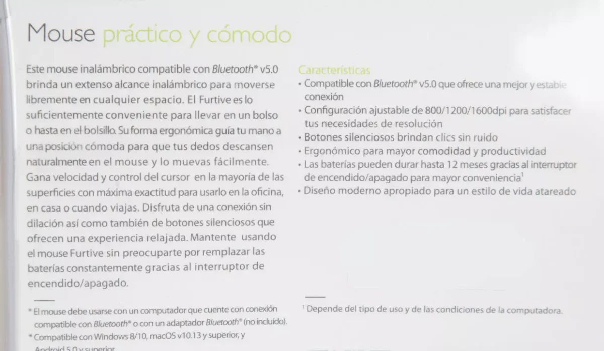 - Este mouse inalámbrico compatible con Bluetooth® v5.0 ofrece un amplio alcance inalámbrico para moverse libremente por cualquier espacio. El Furtive es lo suficientemente cómodo como para llevarlo en un bolso o incluso en el bolsillo.