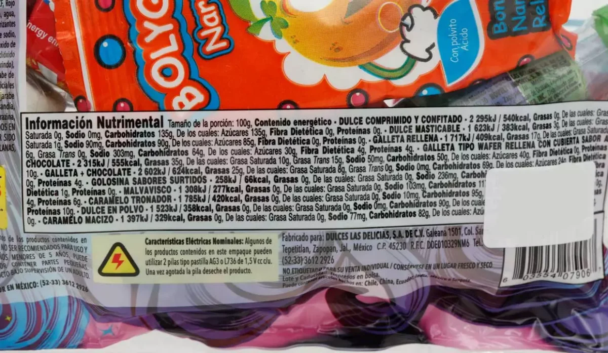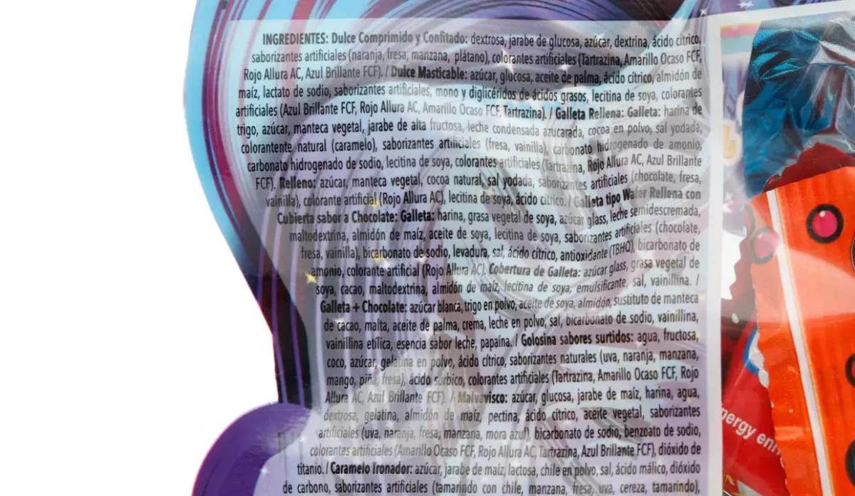 - Dulce comprimido y confita, azúcares añadidos, glucosa, jarabe de maíz, dextrina de maíz, estearato de magnesio, ácido cítrico, sabores artificiales, colores artificiales.