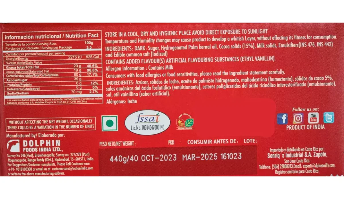 - Azúcar, sólidos de leche, aceite de palmiste hidrolizado, maltodextrina (humectante) sólidos de cacao 5%, sales amónicas del ácido fosfatídico (emulsionante), esteres poligliceridos de ácido ricinólico interesterificado, sal, etil vainilla (sabor artificial).