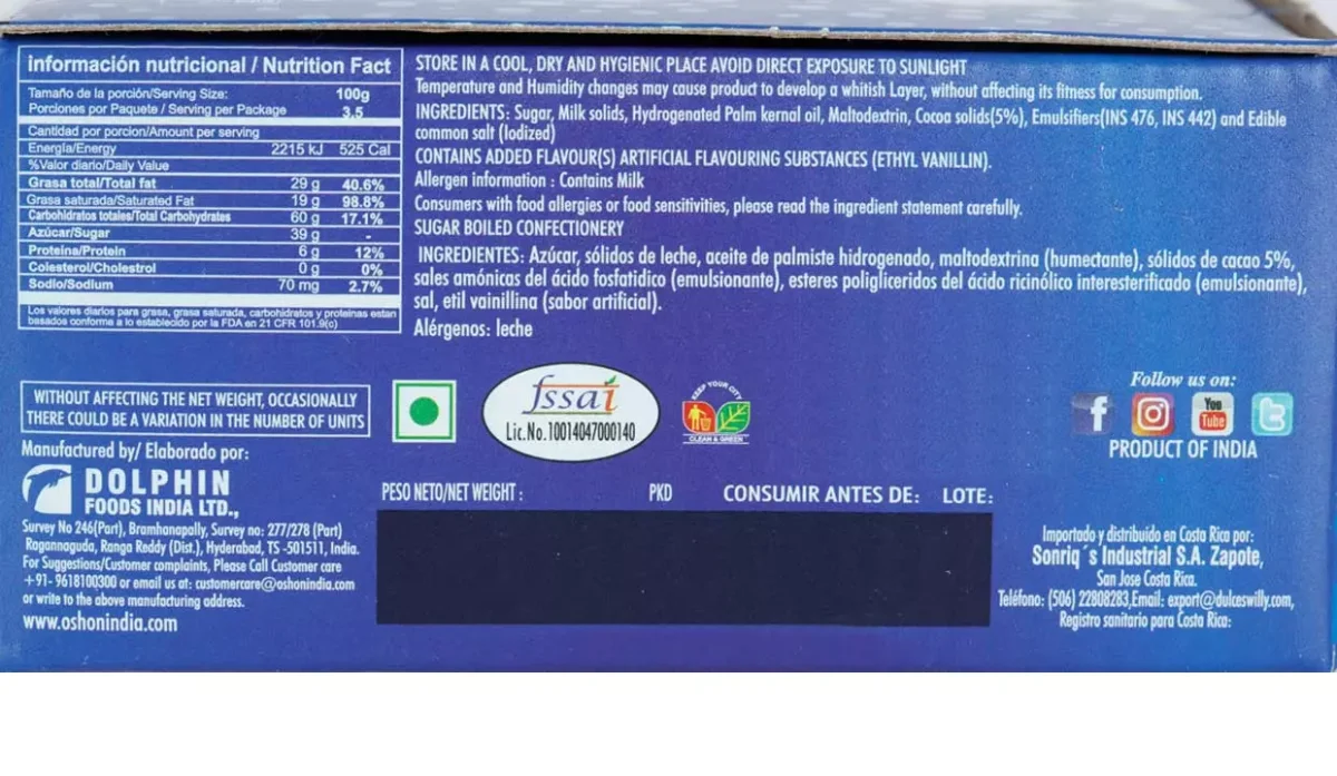 - Azúcar, sólidos de leche, aceite de palmiste hidrogenado, maltodextrina (humectante), sólidos de cacao 5%, sales amónicas del ácido fosfatidico (emulsionante), esteres poligliceridos del ácido ricinólico interesterificado (emulsionante), sal, etil vainilla.