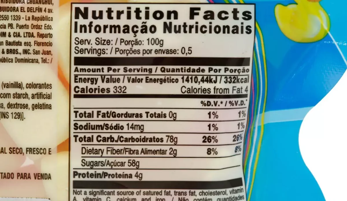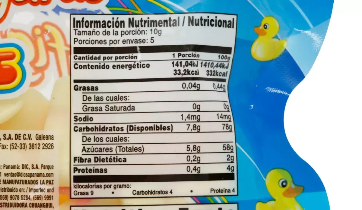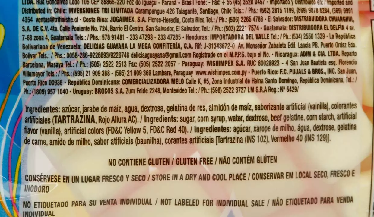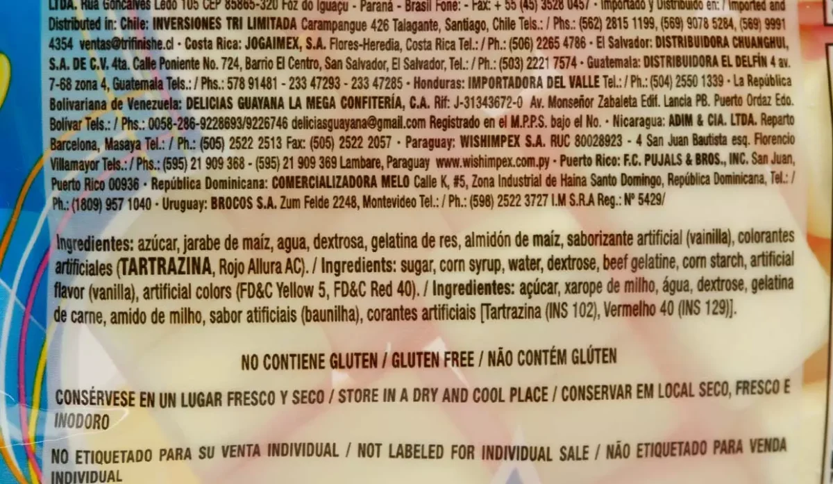 - Azúcar, jarabe de maíz, agua, dextrosa, gelatina de res, almidón de maíz, saborizante artificial vainilla, colorantes artificiales.