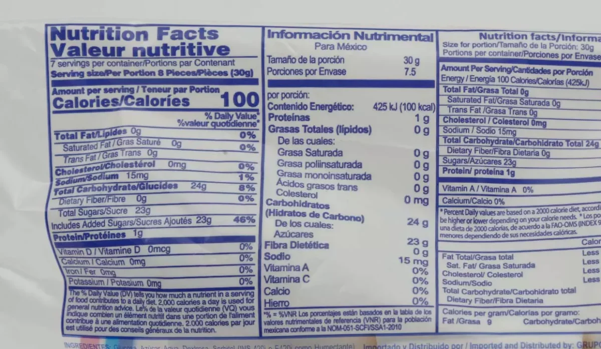- Glucosa, azúcar, agua, dextrosa, sorbitol, gelatina sin sabor grado alimenticio, almidón, saborizantes artificiales, sorbato de potasio, colorante artificial.