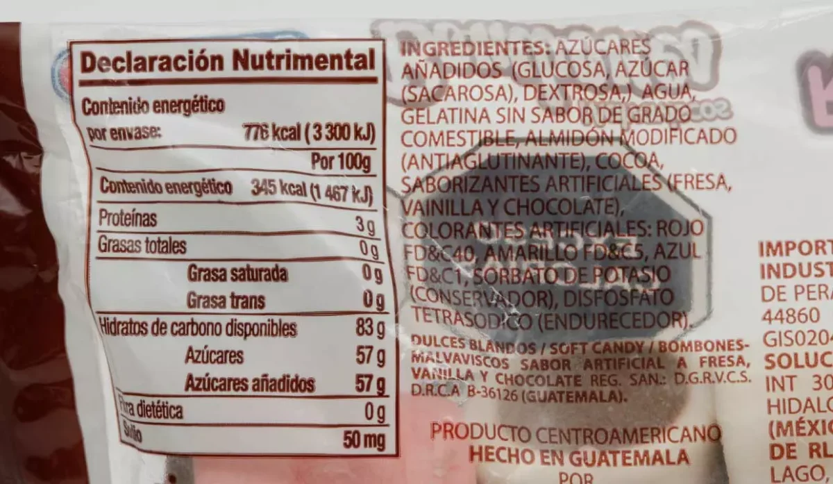 - Azúcares añadidos, glucosa, azúcar, sacarosa, dextrosa, agua, gelatina sin sabor de grado comestible, almidón modificado, cocoa, saborizantes artificiales a fresa vainilla, chocolate y colorantes artificiales.