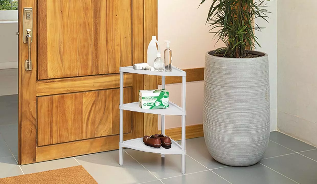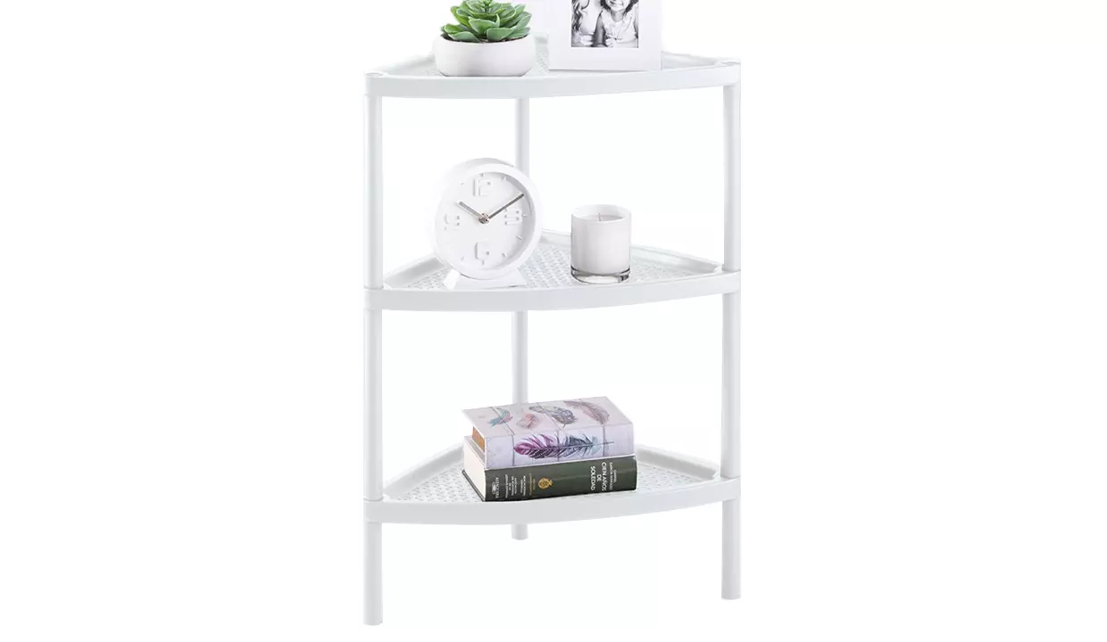 - Mesa multiusos triangular con tejido decorativo y apariencia artesanal.