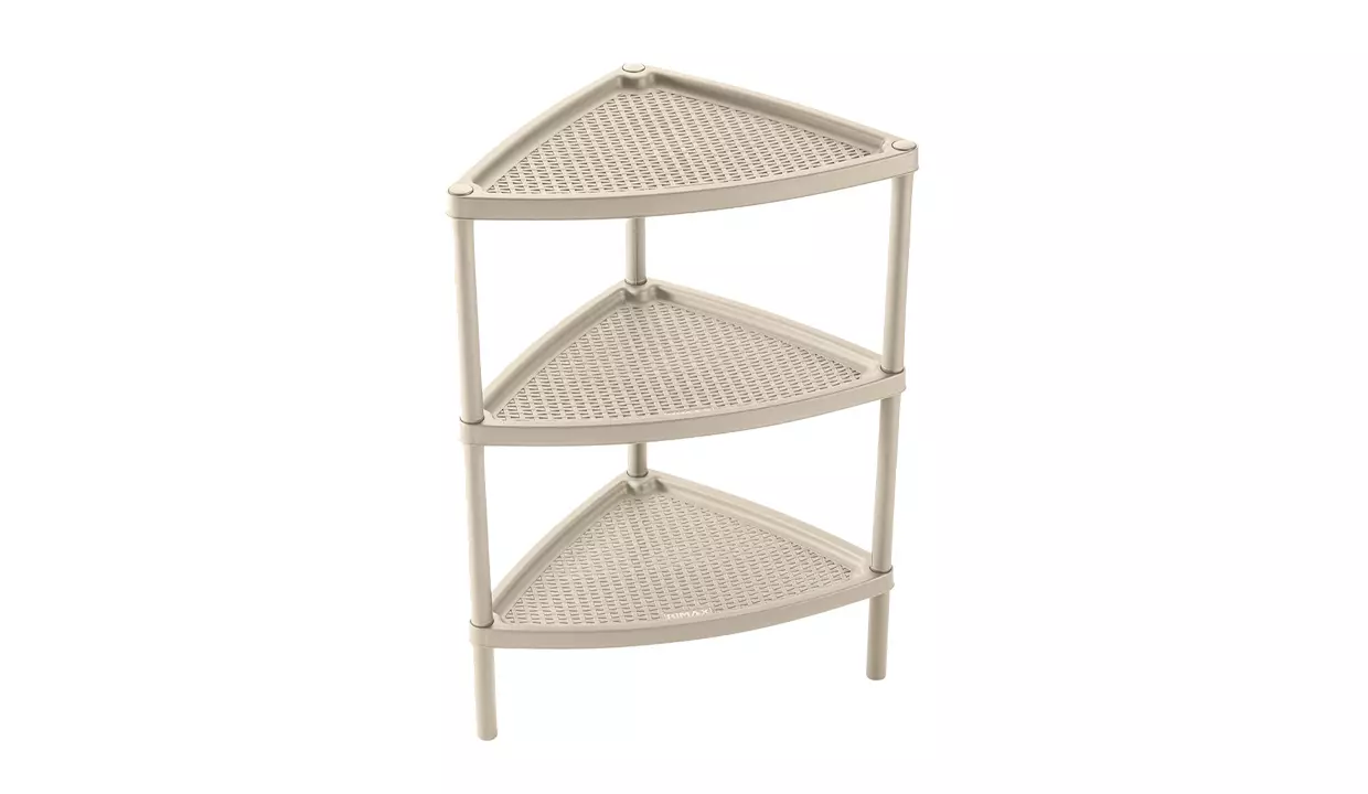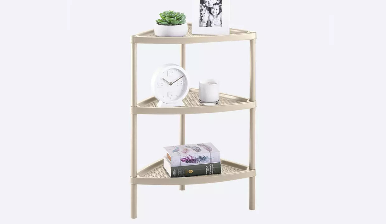 - Mesa multiusos triangular con tejido decorativo y apariencia artesanal.