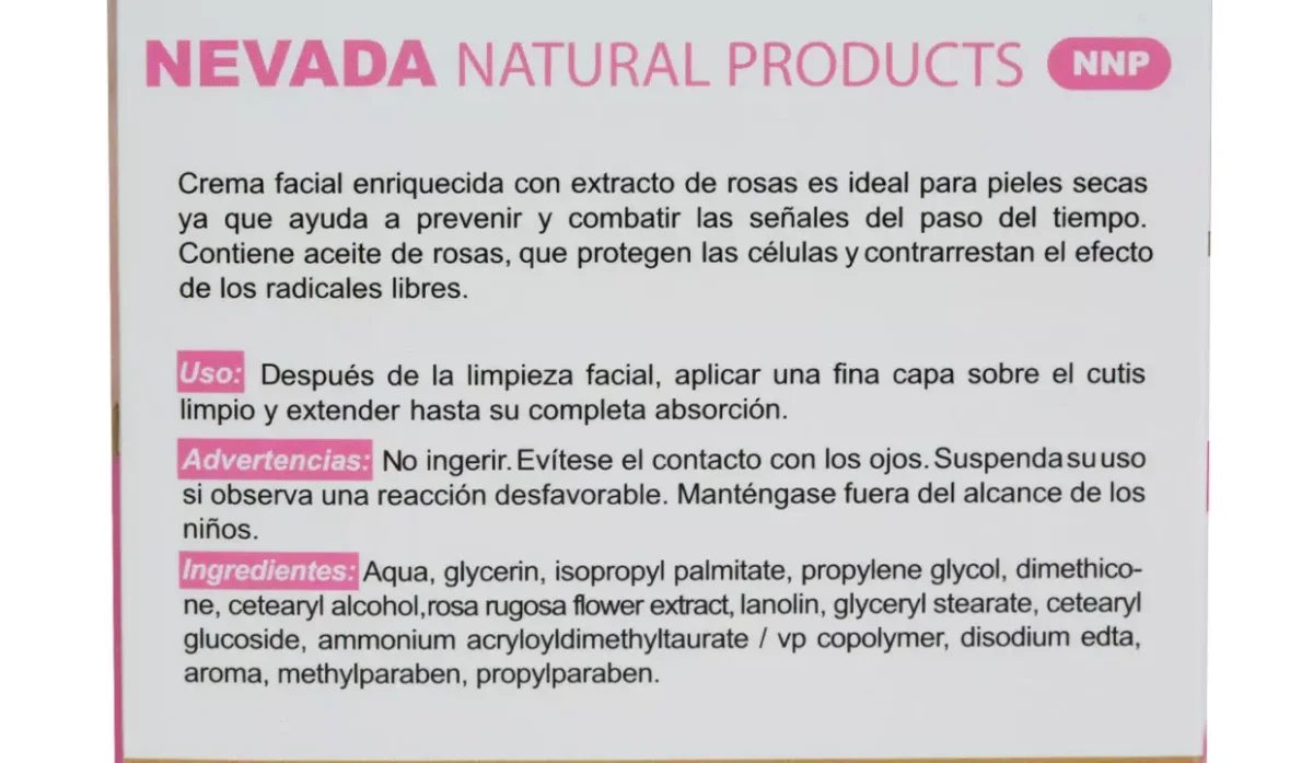 - Agua, glicerina, palmitato de isopropilo, propilenglicol, dimeticona, alcohol cetearílico, extracto de flor de rosa rugosa, lanolina, estearato de glicerilo, glucósido de cetearilo, amonio, acriloildimetiltaurato, copolímero vp, edta disódico, aroma, metilparabeno, propilparabeno.