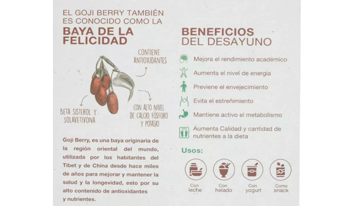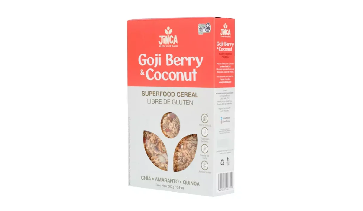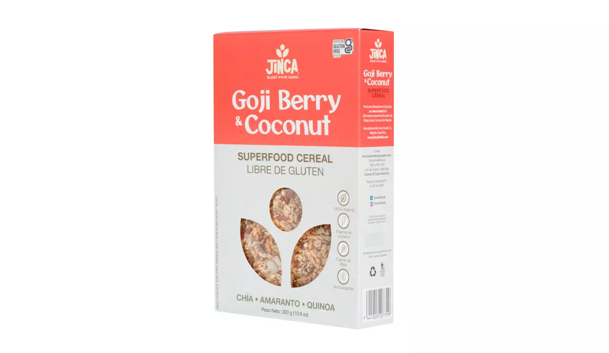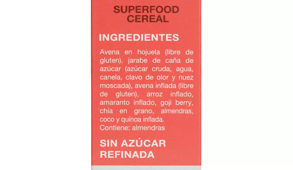 - Avena en hojuela, (libre de gluten) jarabe de caña de azúcar, (azúcar cruda, agua canela, clavo de olor y nuez moscada) avena inflada, (libre de gluten) arroz inflado, amaranto inflado, goji berry, chía en grano, almendras, coco y quínoa inflada.