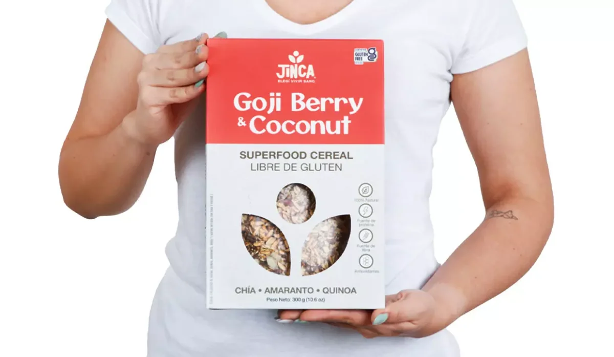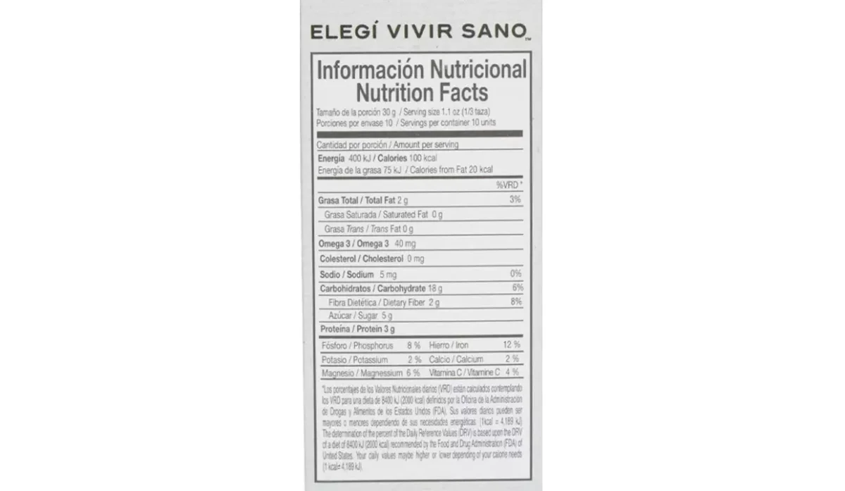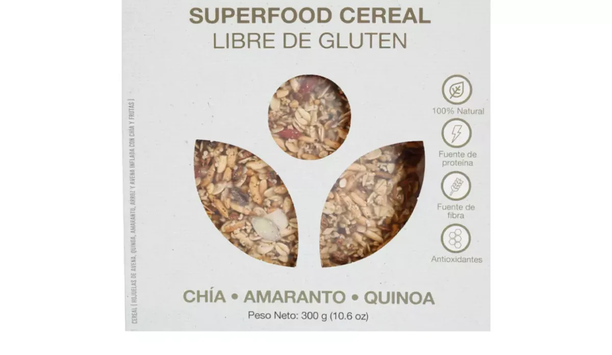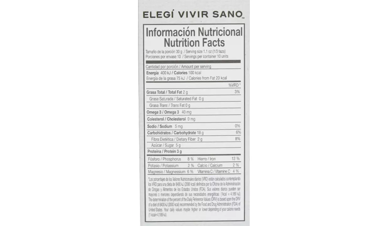 - Avena en hojuela, (libre de gluten) jarabe de caña de azúcar, (azúcar cruda, agua canela, clavo de olor y nuez moscada) avena inflada, (libre de gluten) arroz inflado, amaranto inflado, goji berry, chía en grano, almendras, coco y quínoa inflada.