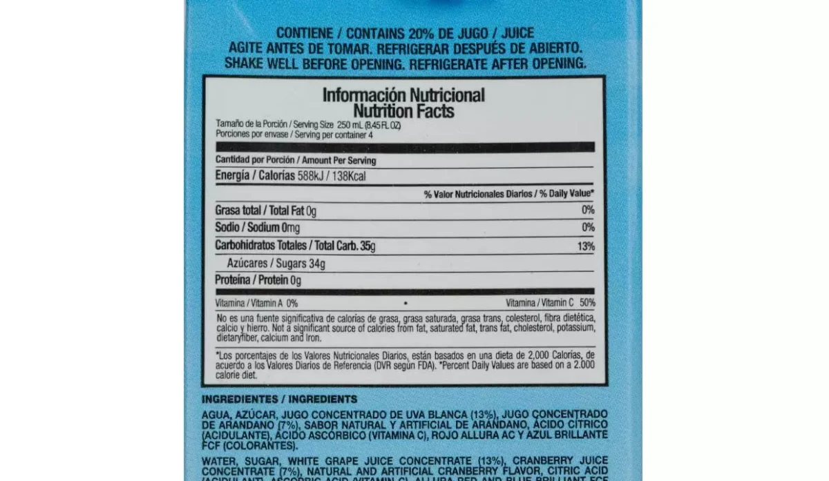 - Agua, azúcar, jugo concentrado de uva blanca (13%), jugo concentrado de arándano (7%), sabor natural y artificial de arándano, ácido cítrico (acidulante), ácido ascórbico (vitamina C), rojo allura ac y azul brillante fcf como colorantes.